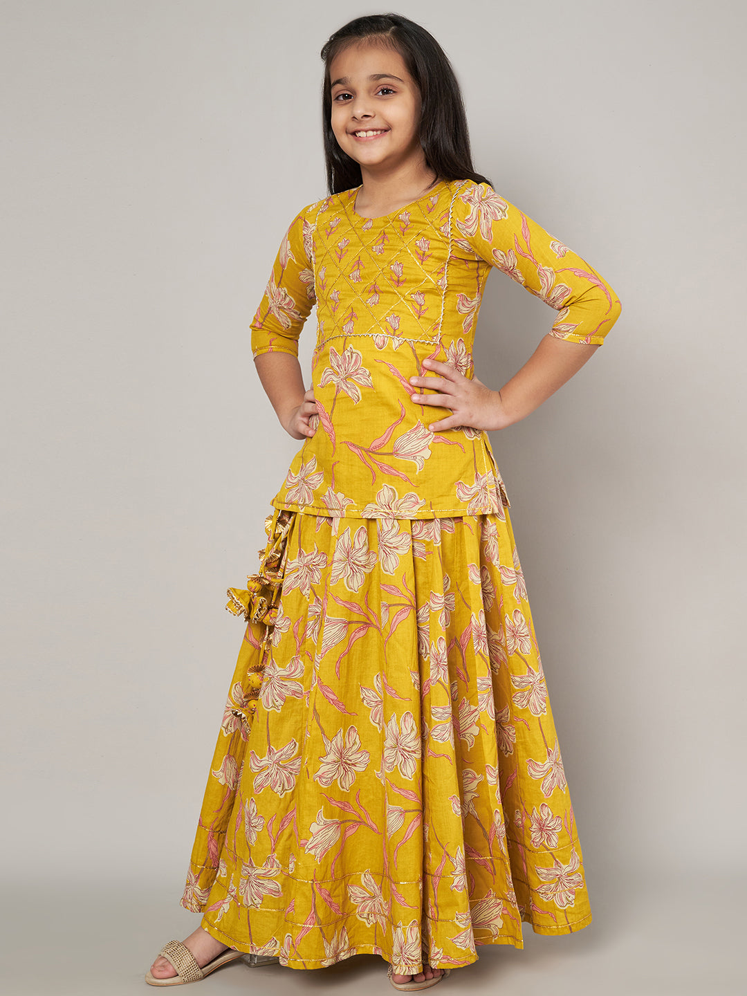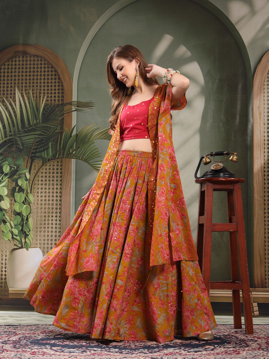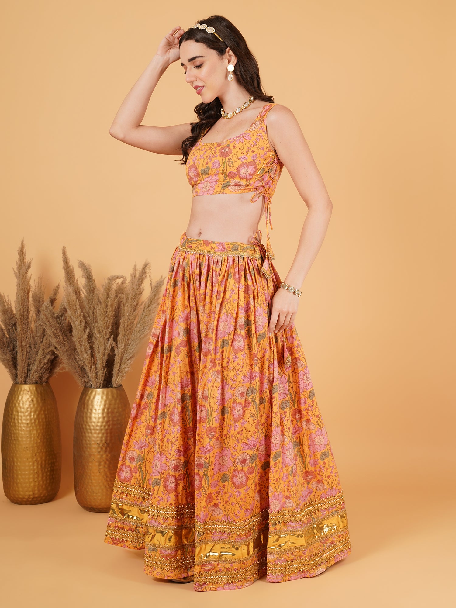 Mustard Festive Floral Printed Lehenga Choli Set with Dupatta for Women