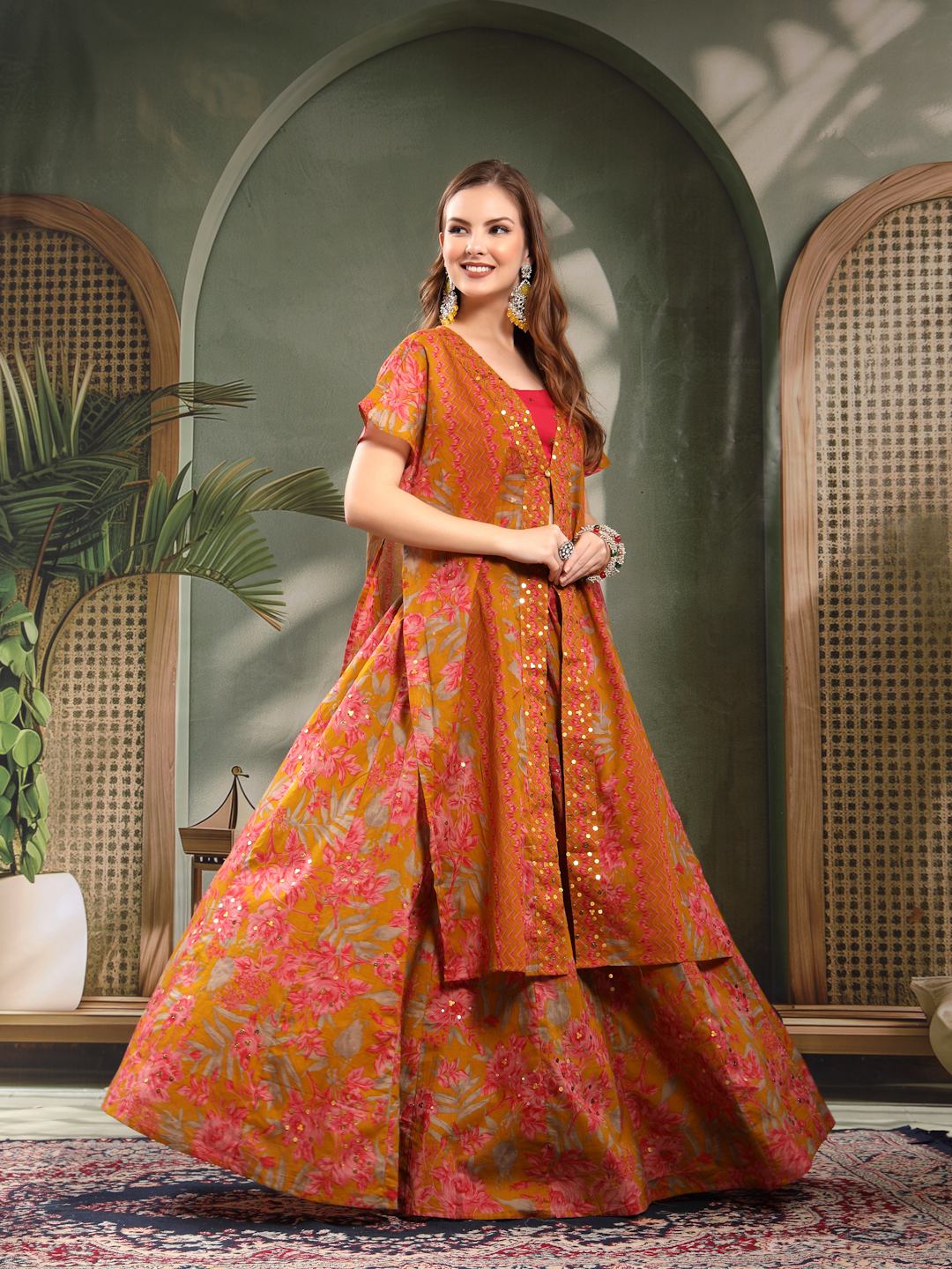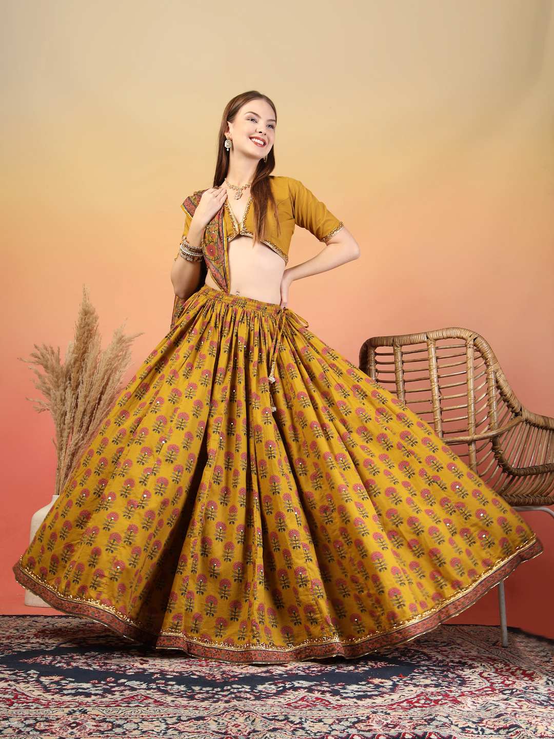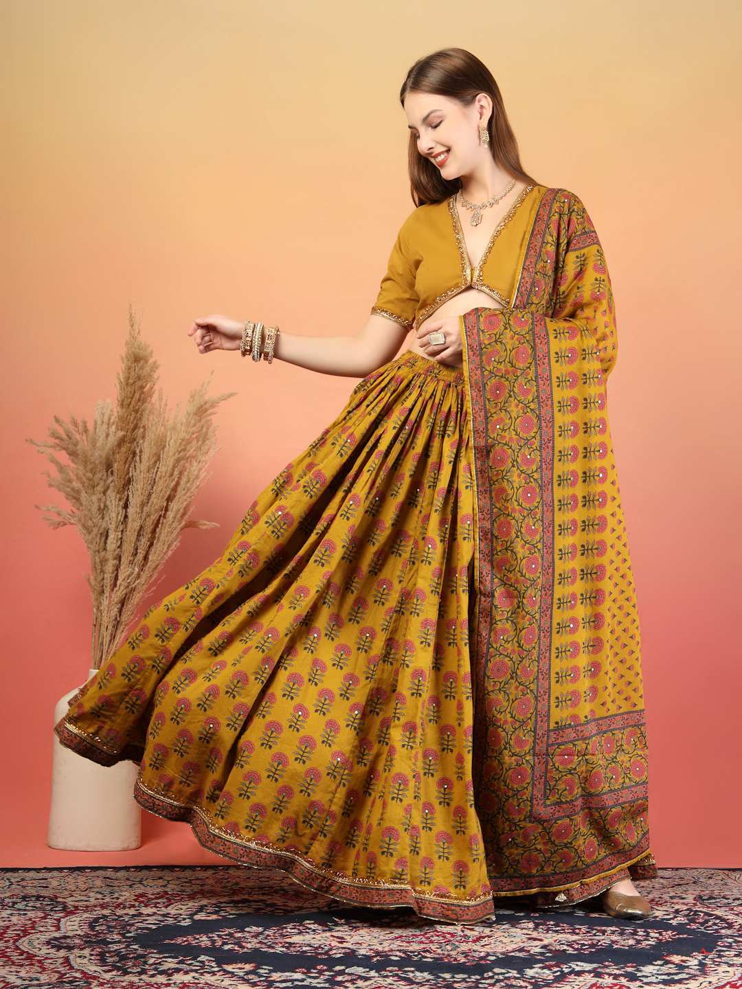 Mustard Festive Floral Printed Lehenga Choli Set with Dupatta for Women