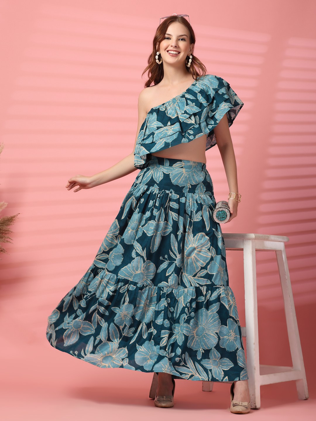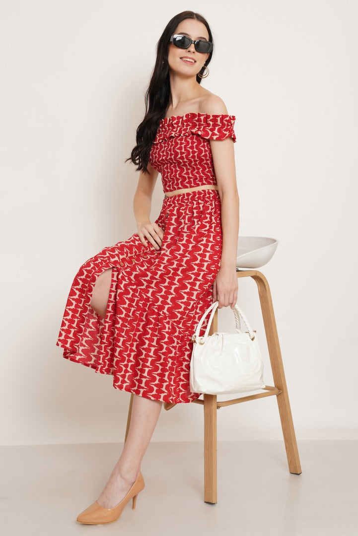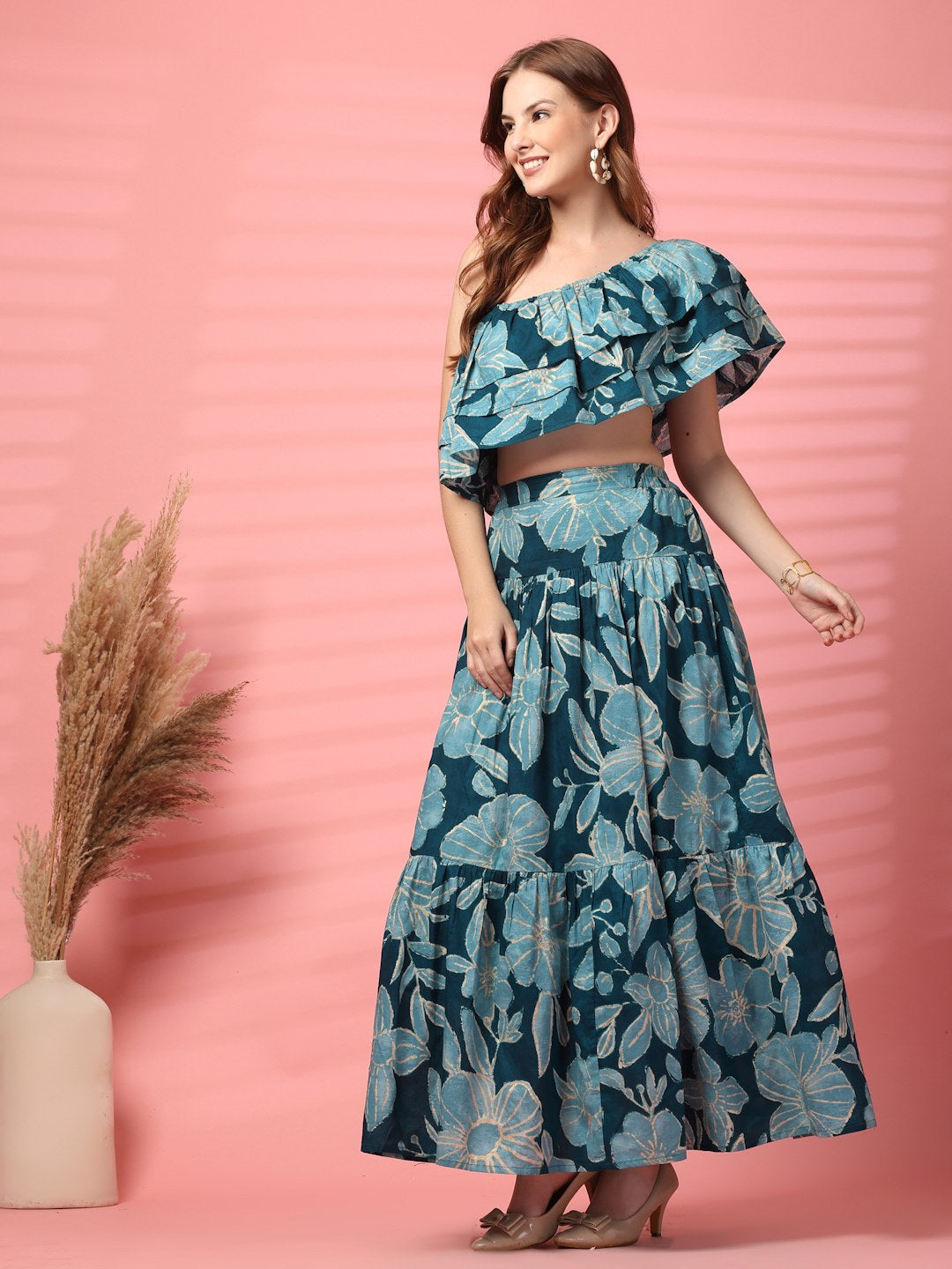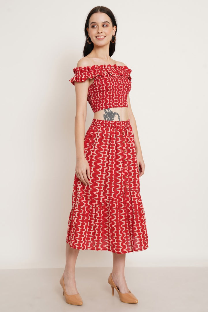 Off Shoulder Top and Skirt Co-Ord Set in Jaipuri Cotton for Women