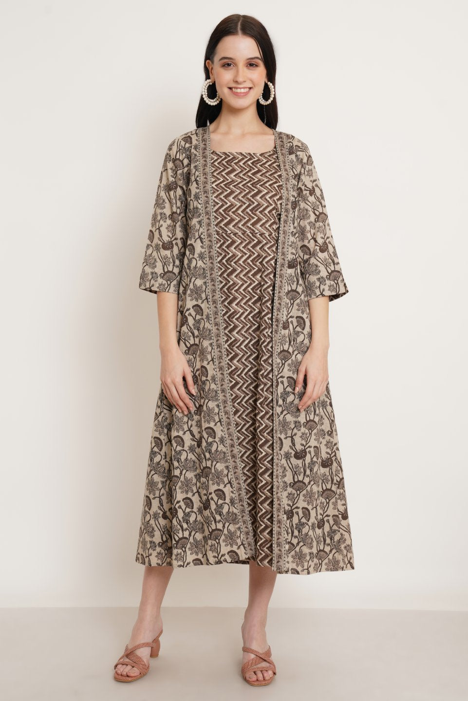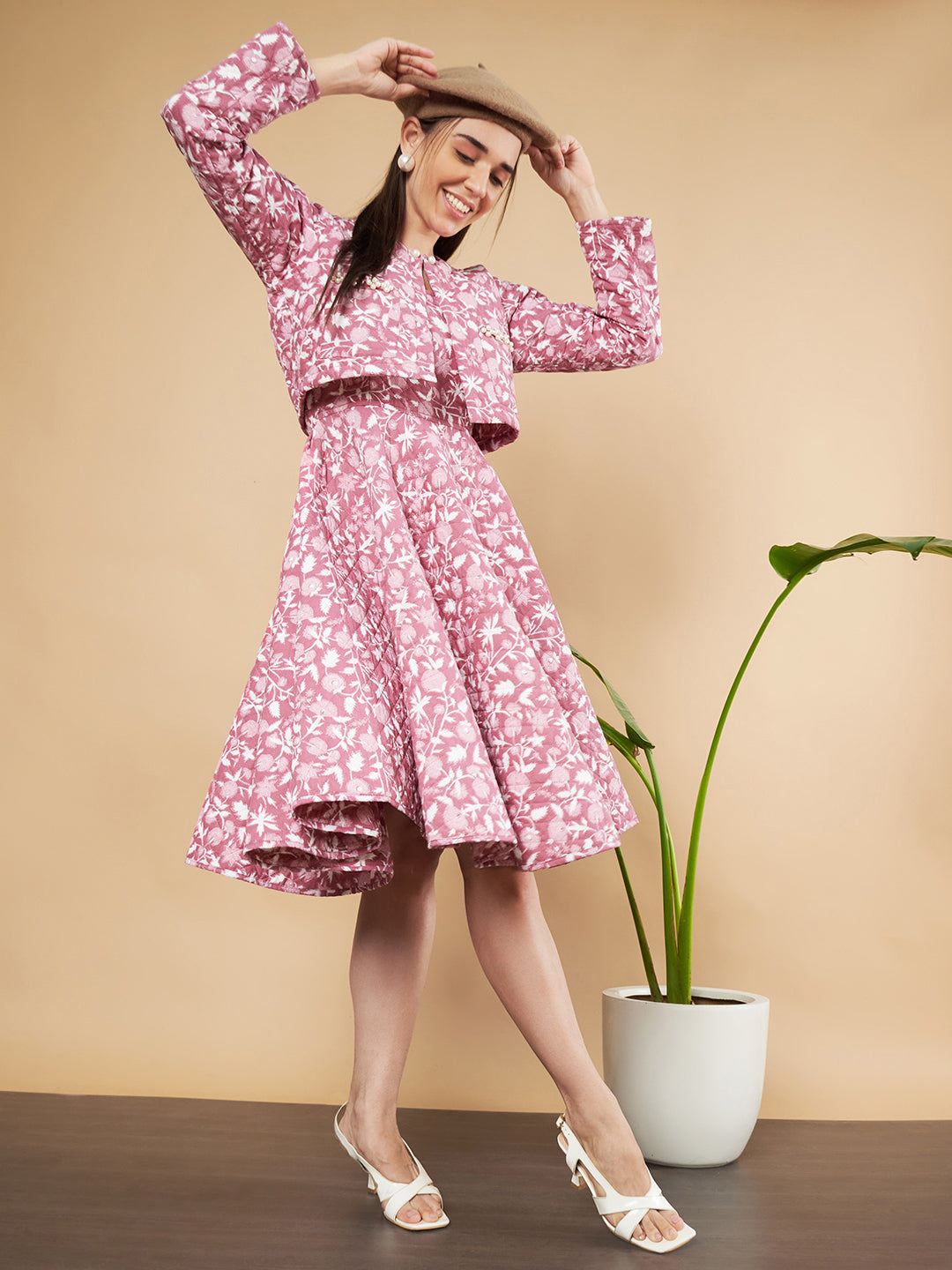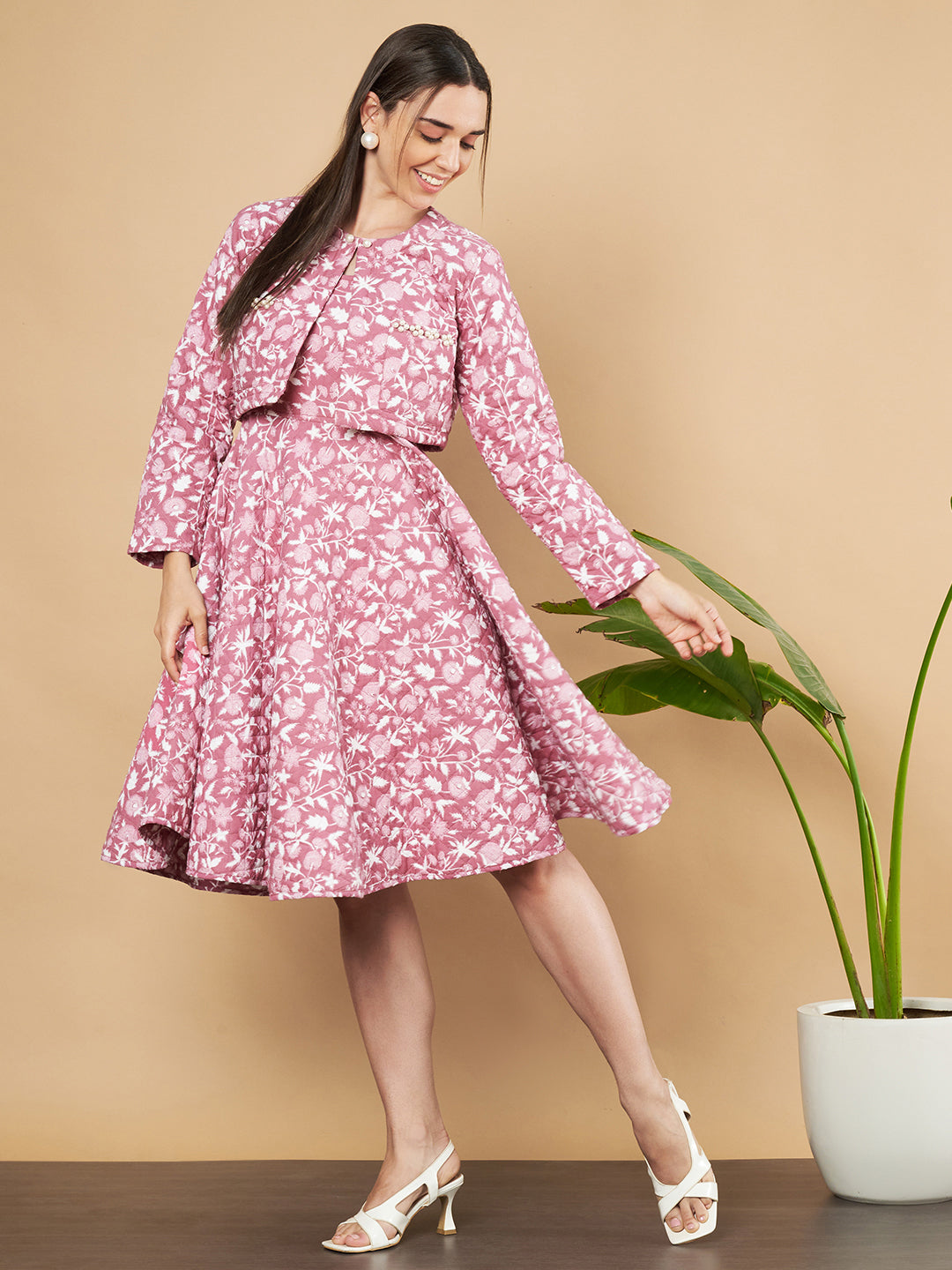 Floral Printed Jaipuri Cotton Shrug and Dress Co-Ord Set For Women