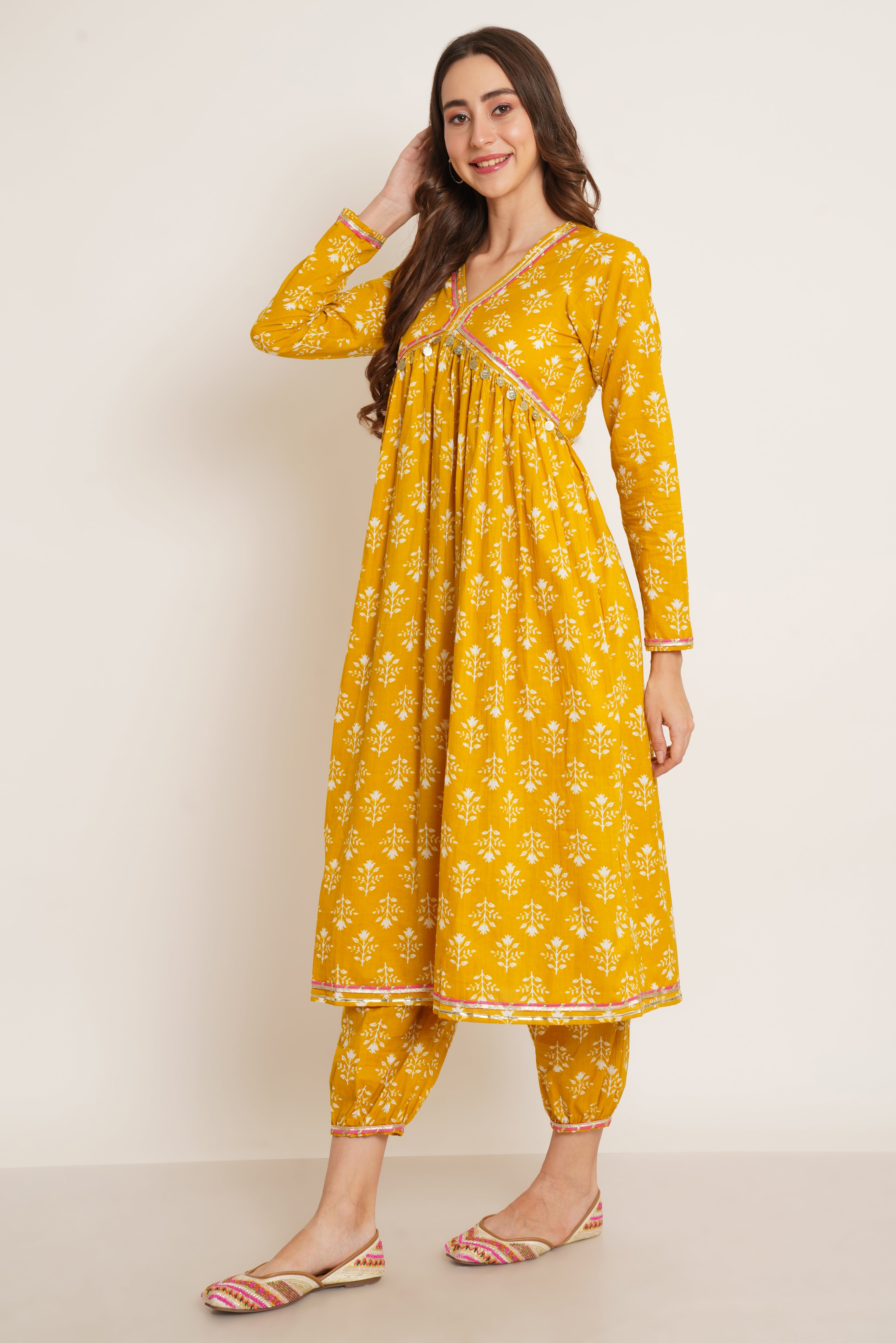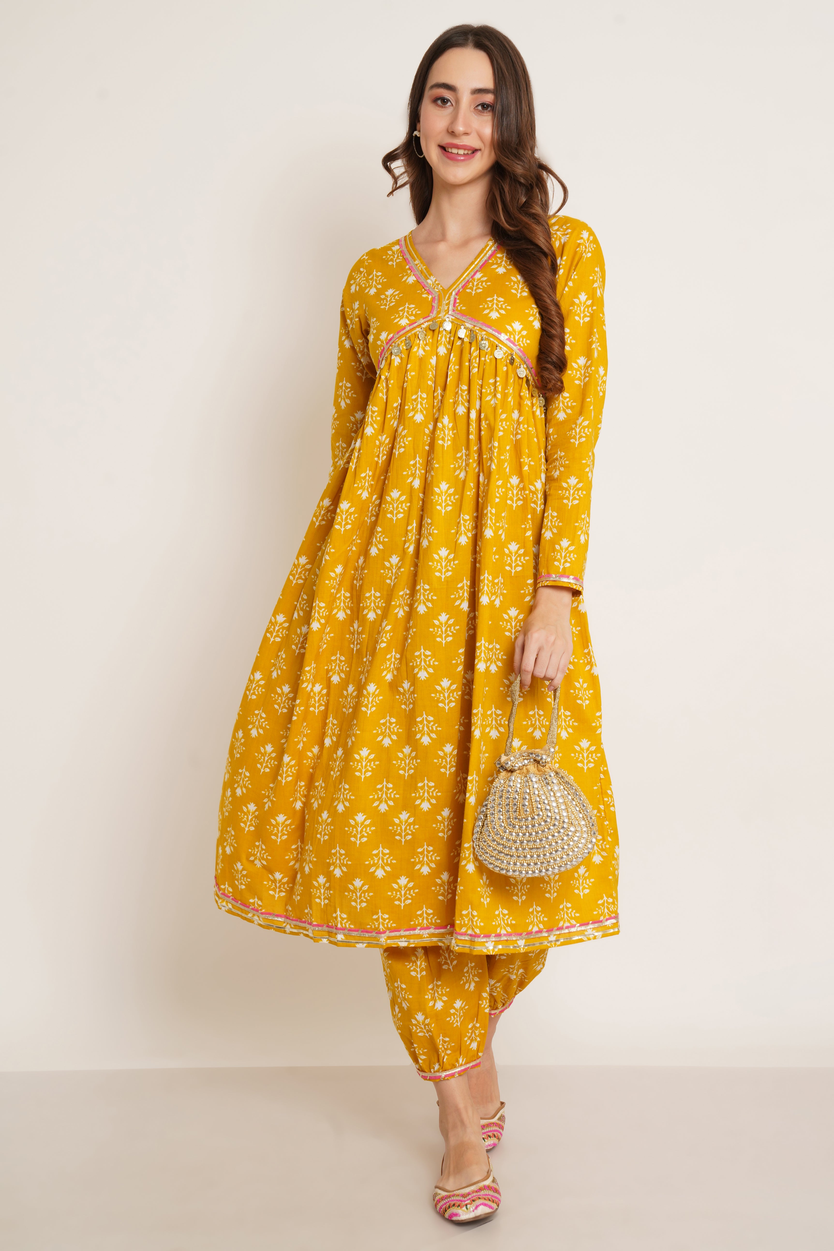Mustard Yellow Cotton Kurta with Afghani Pant Set for Women