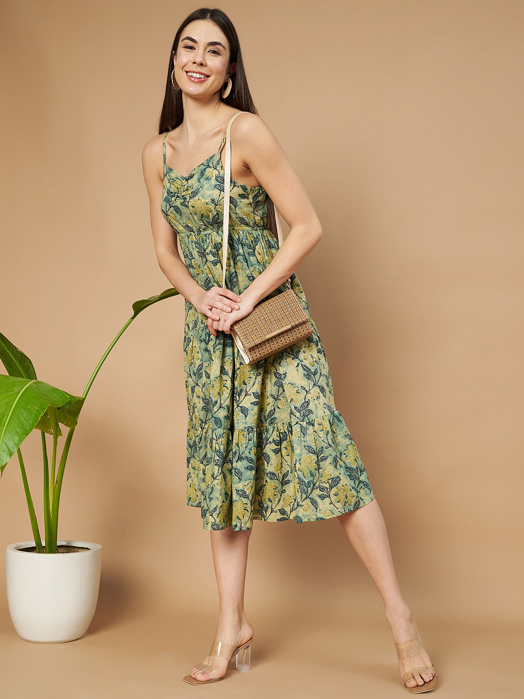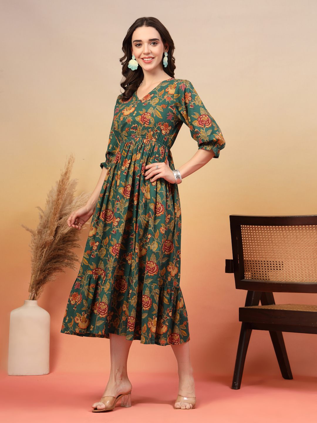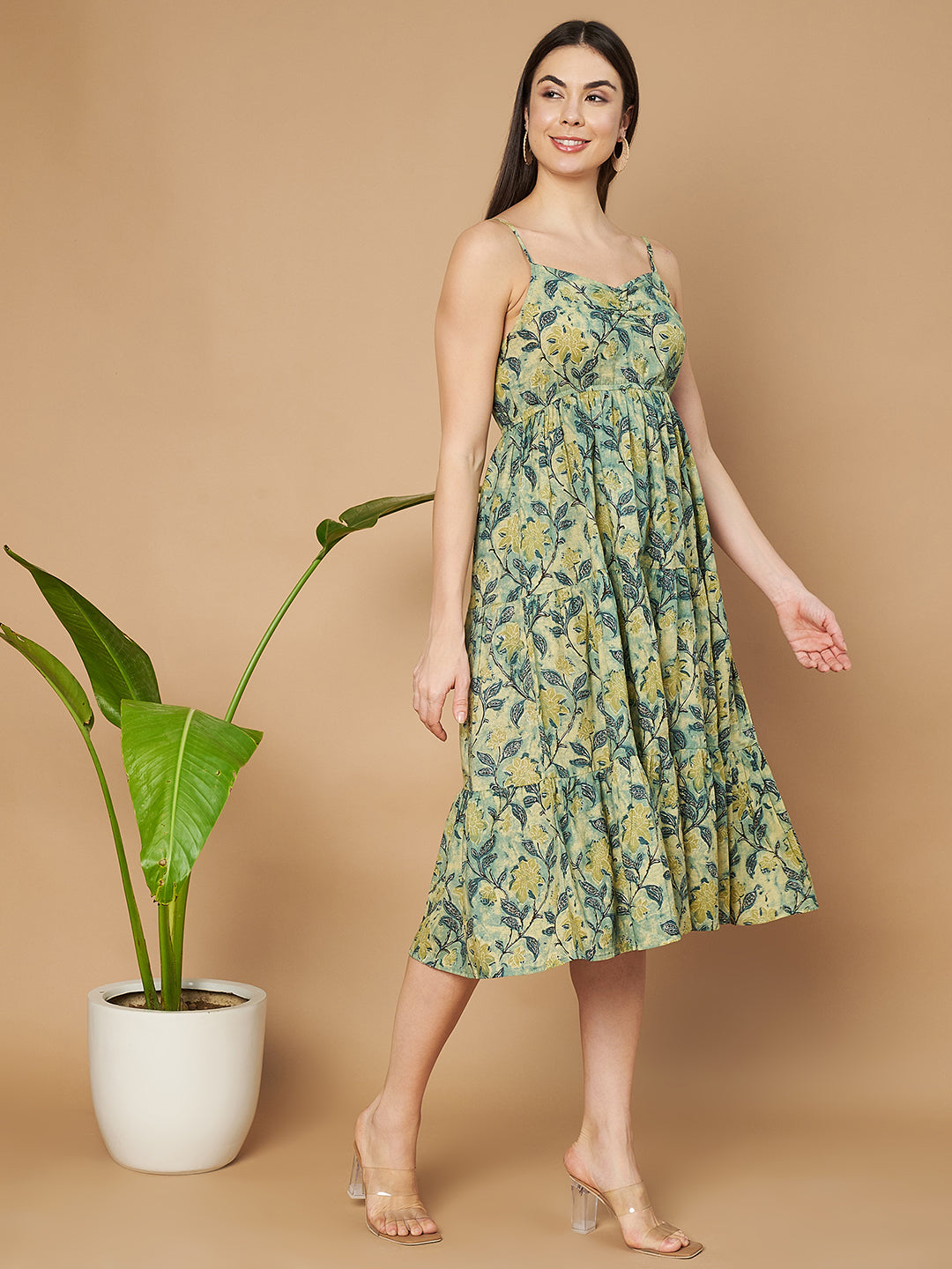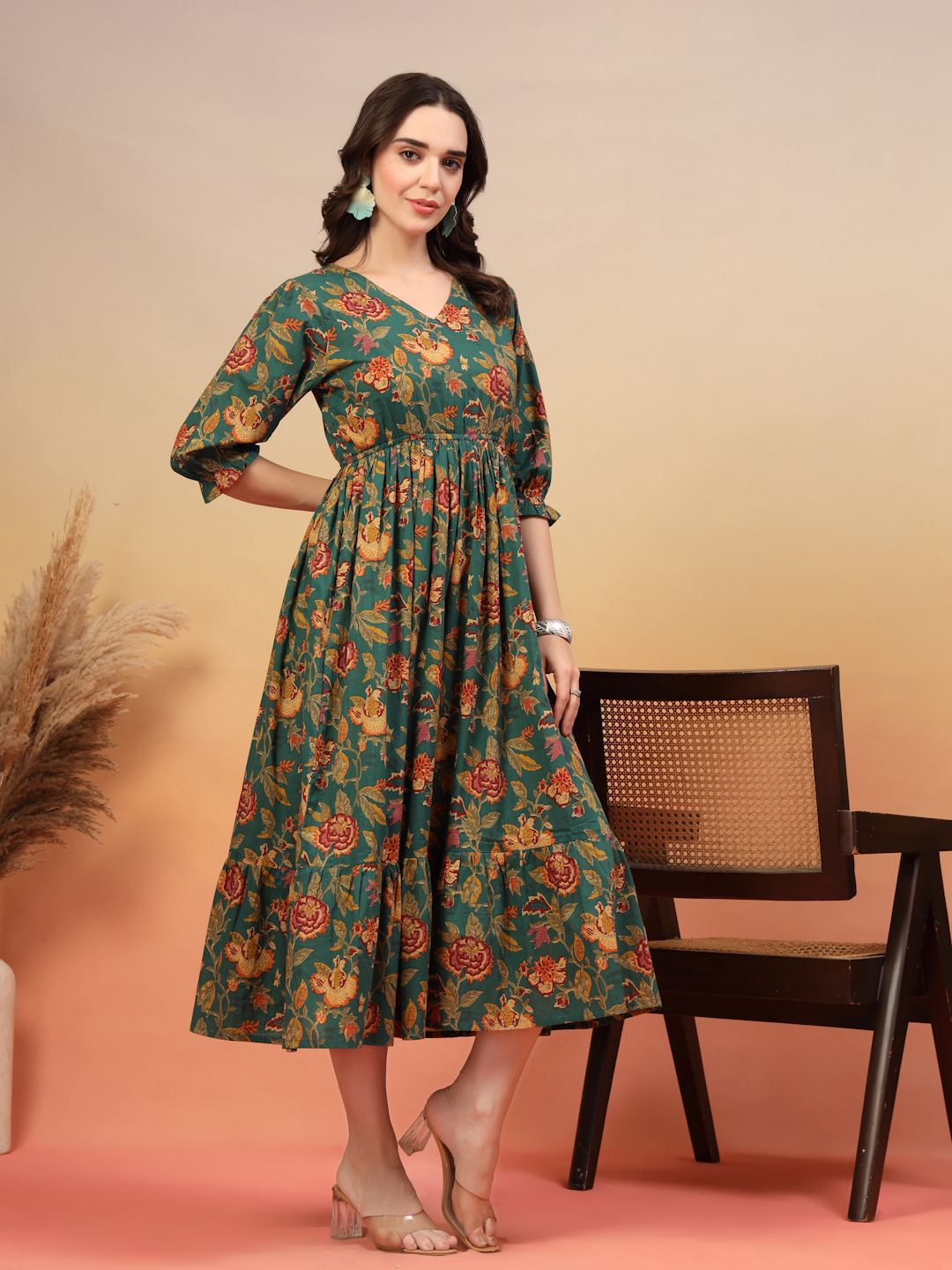 Green Floral Fusion Fit-and-Flare Cotton Dress For Women