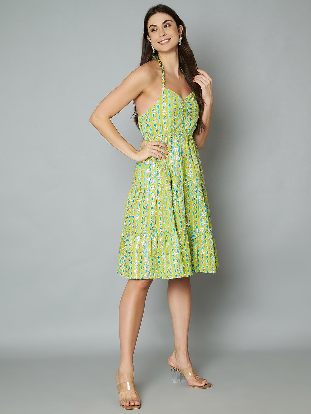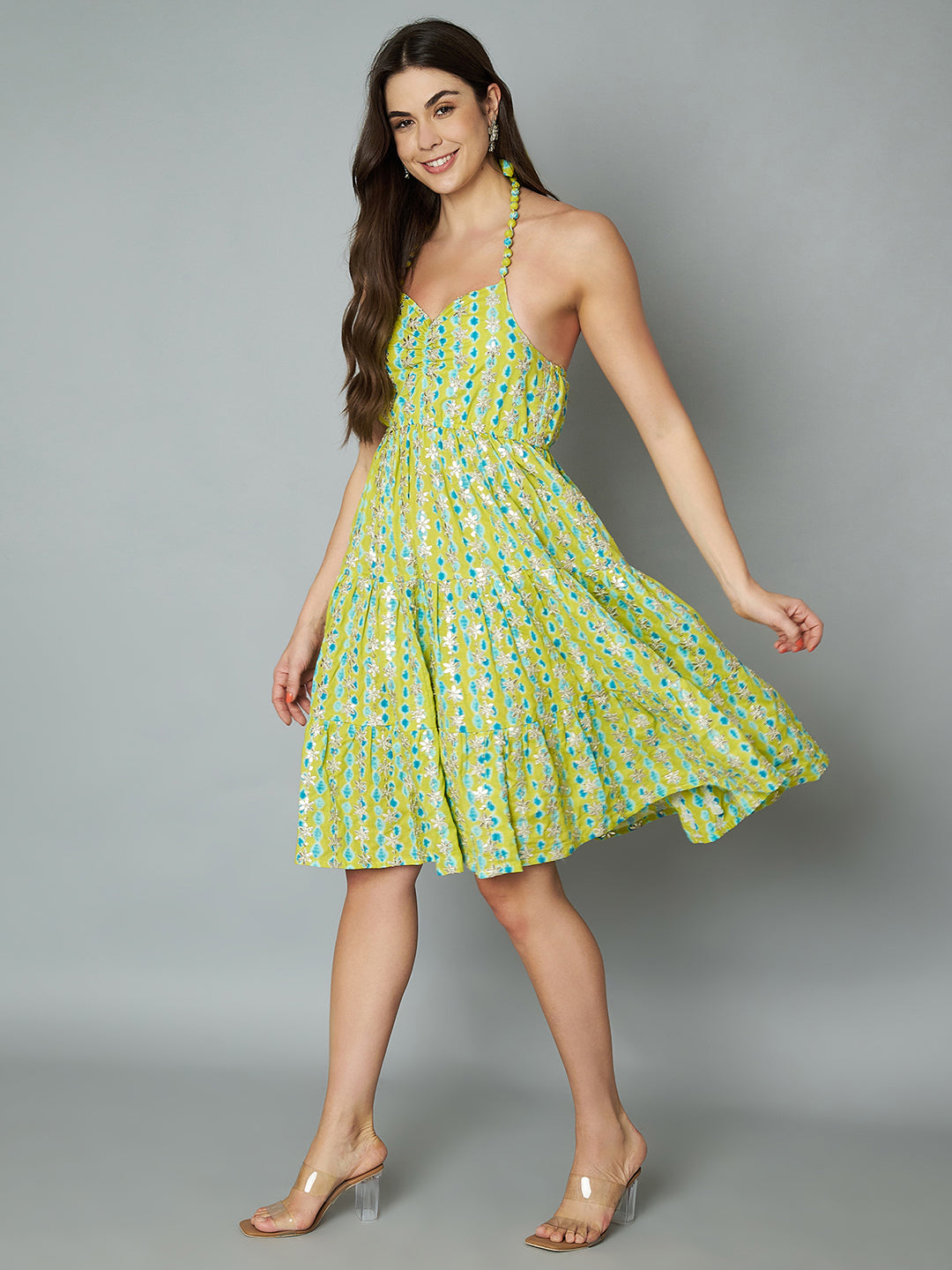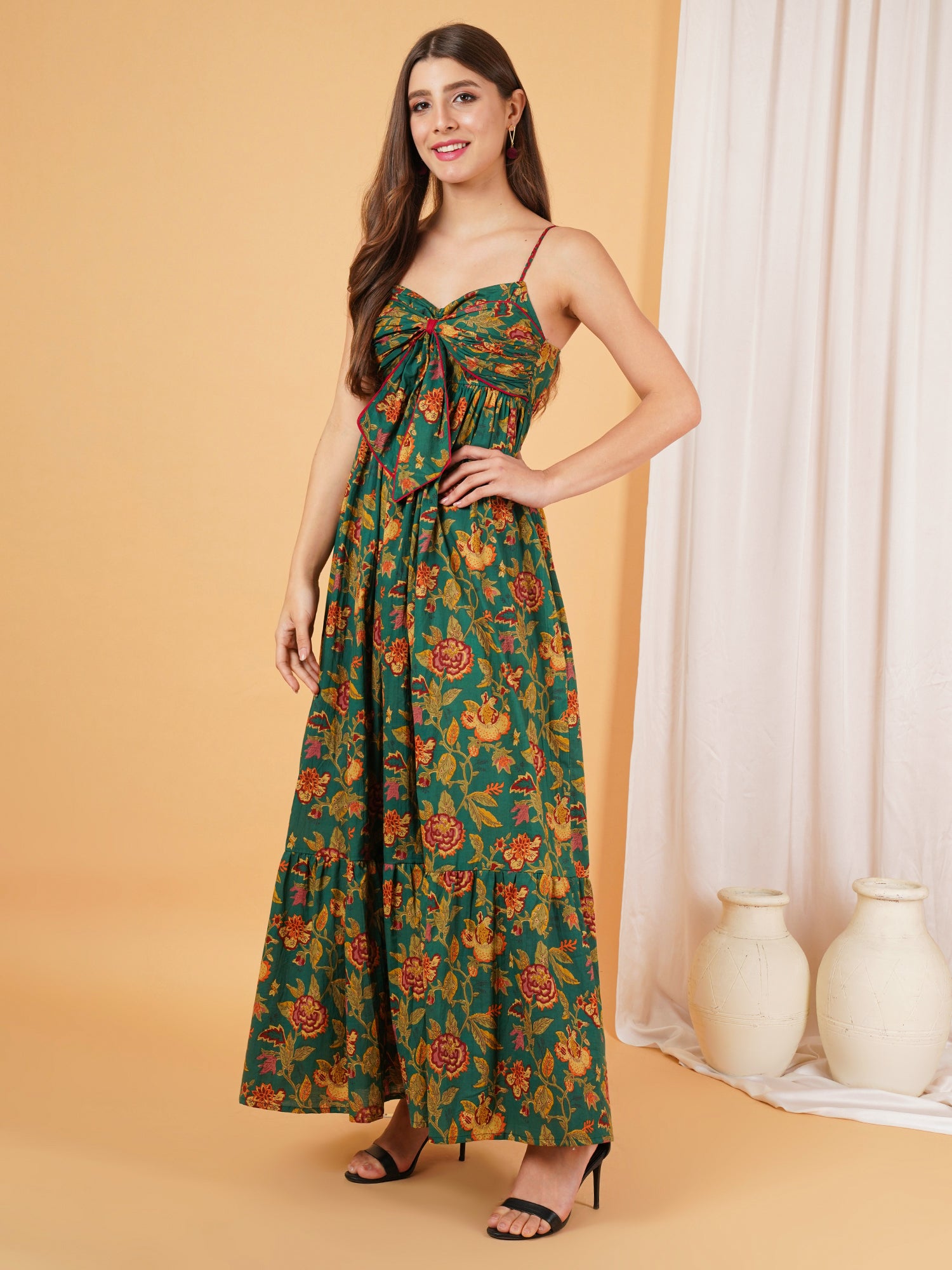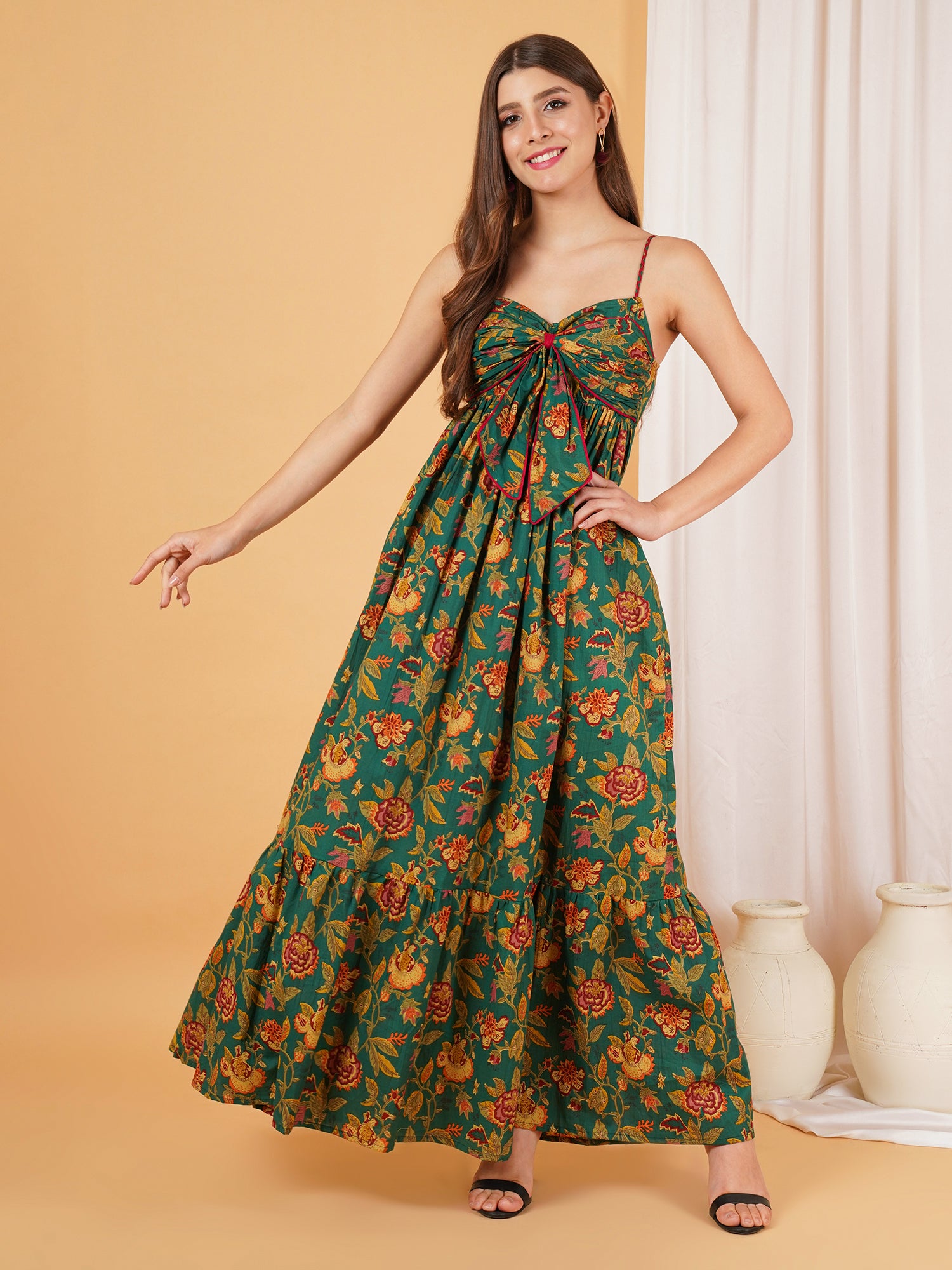 Green Floral Fusion Fit-and-Flare Cotton Dress For Women