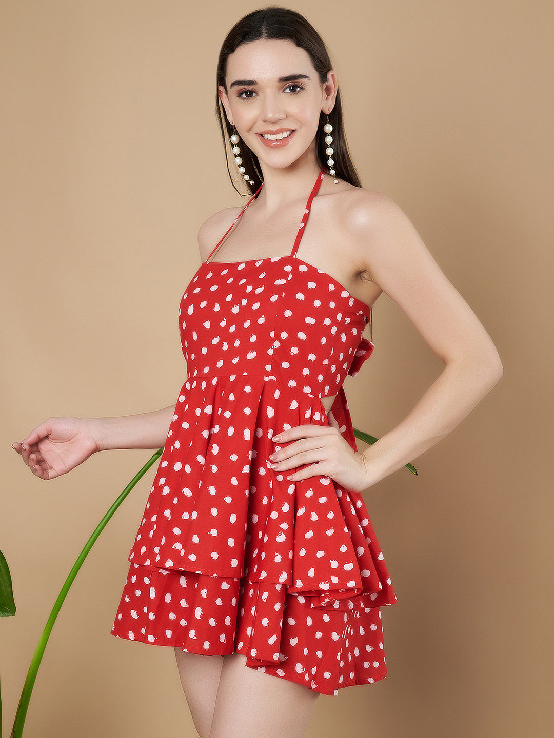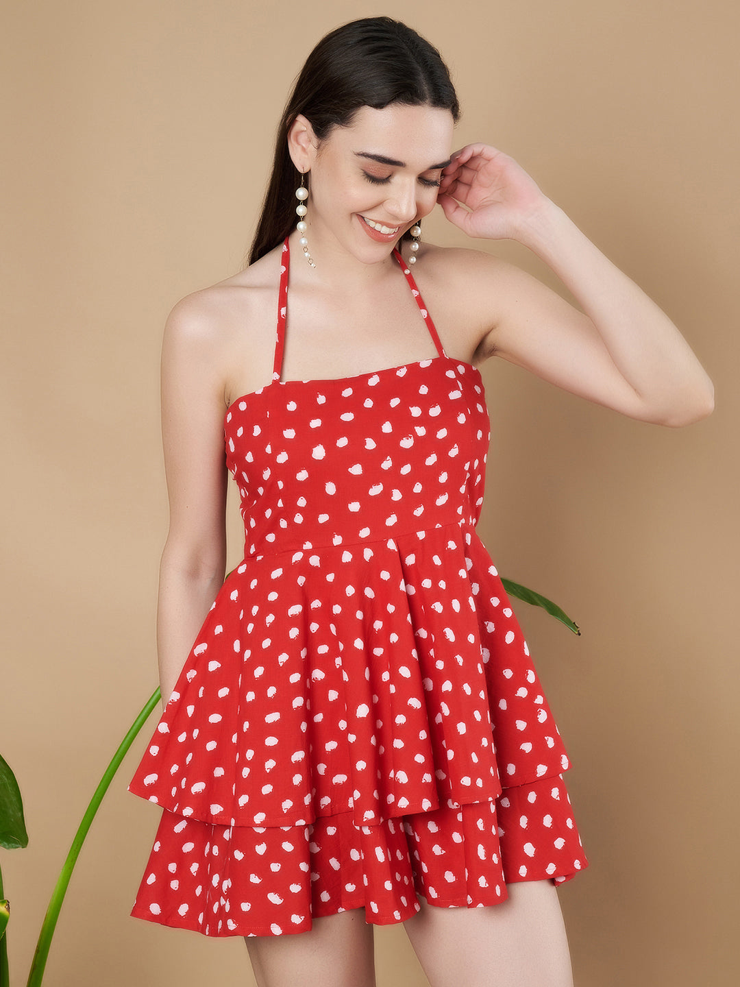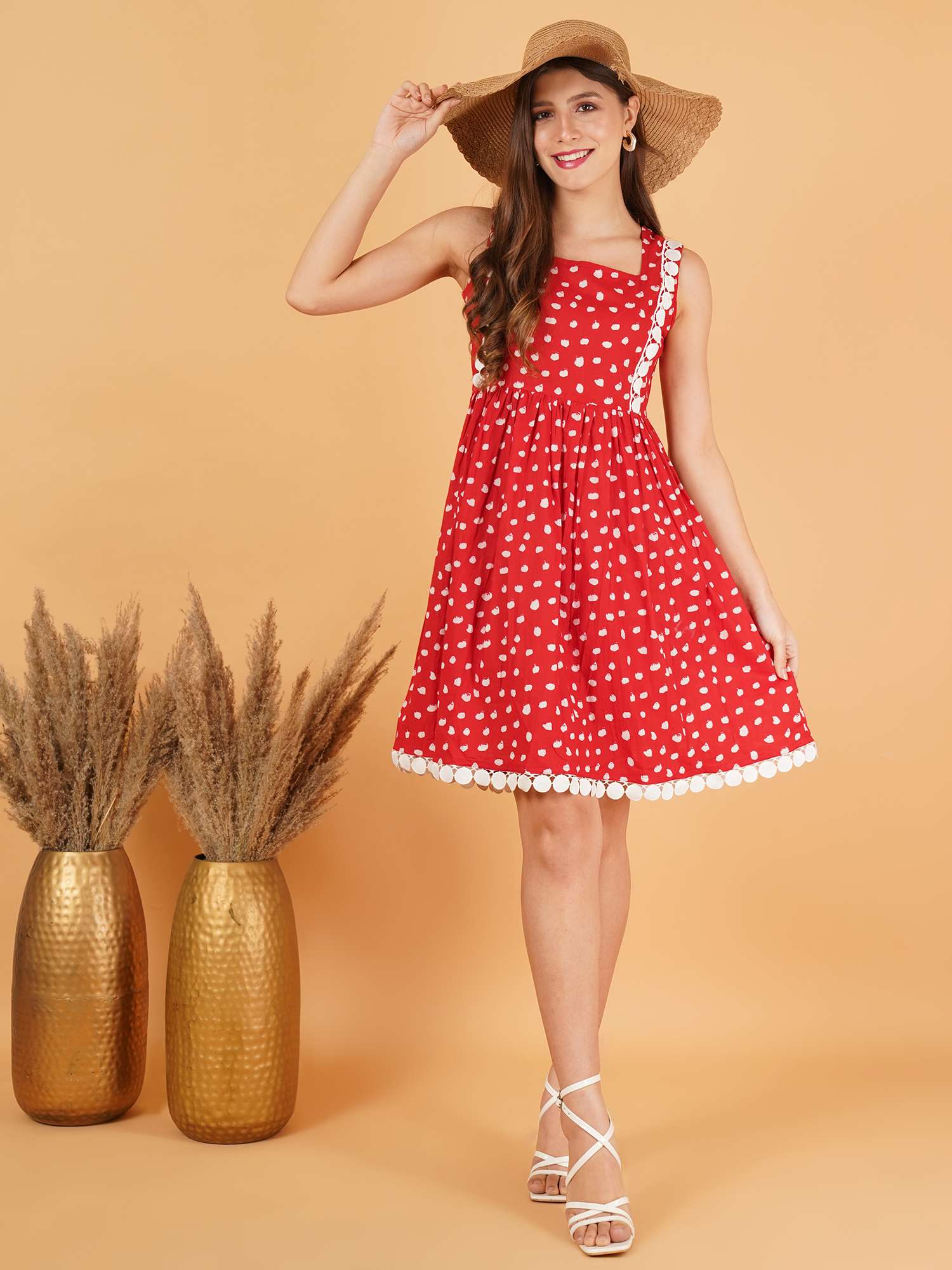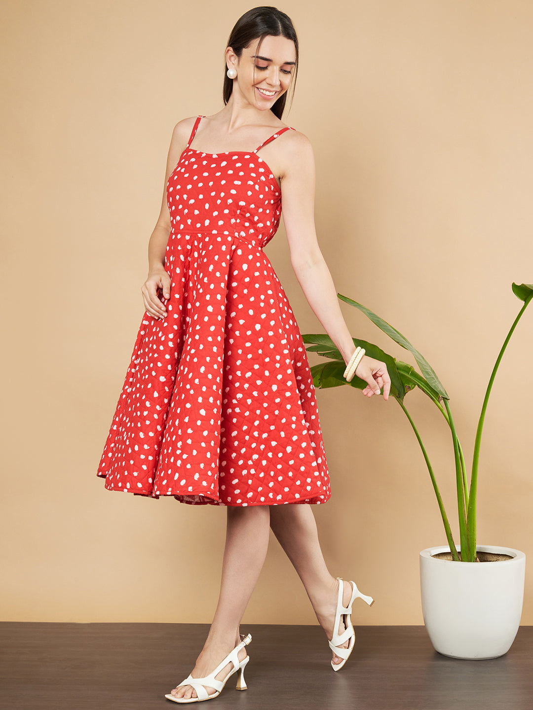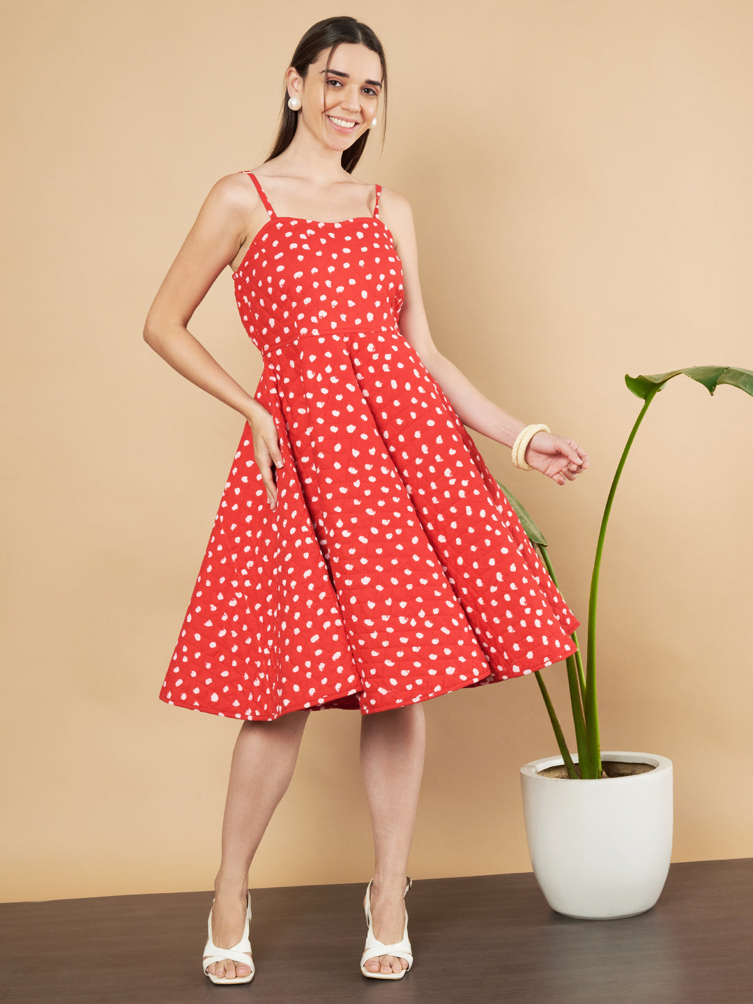 Red Sleeveless Polka Dot Cotton Fit & Flare Dress For Women
