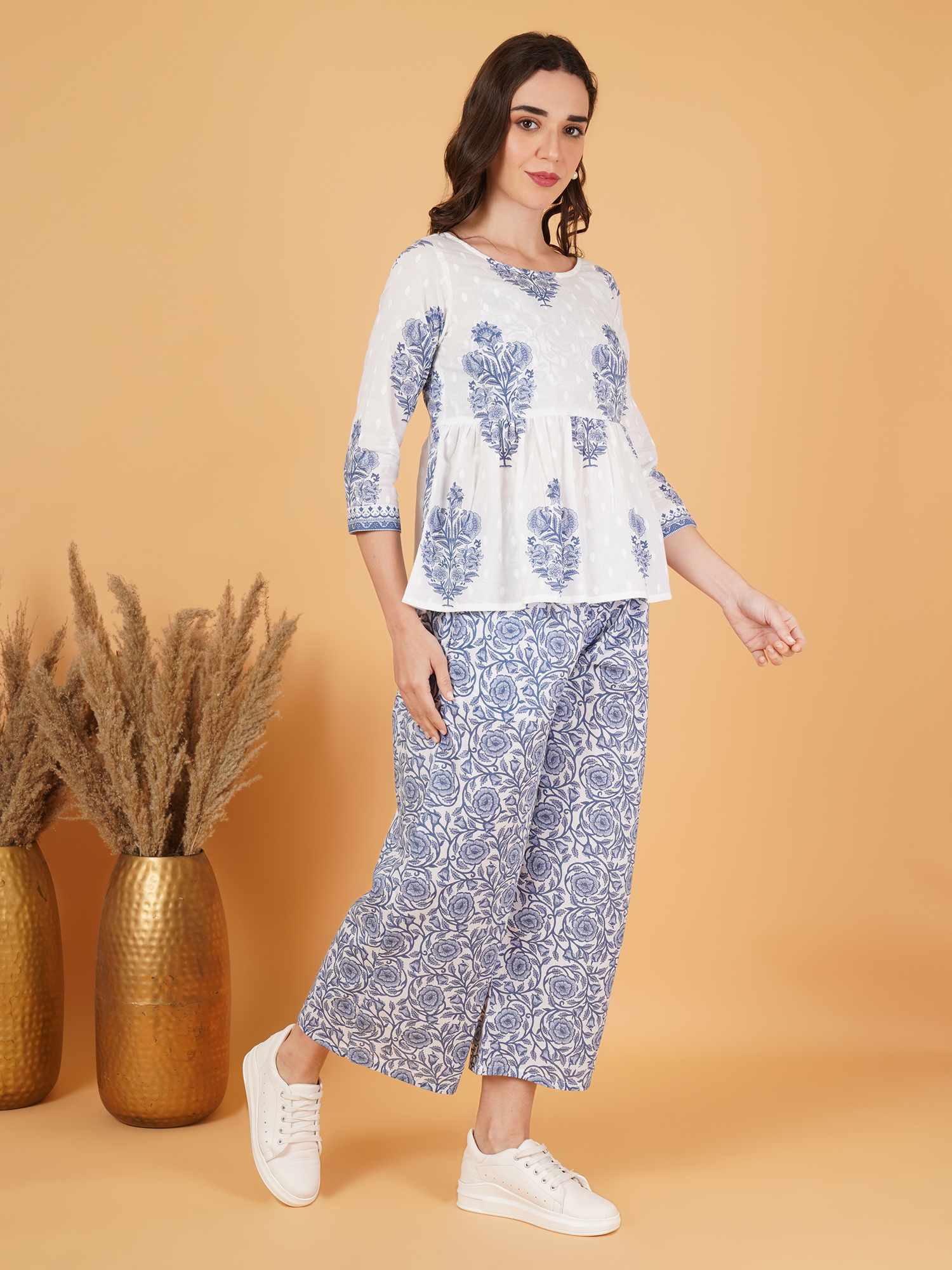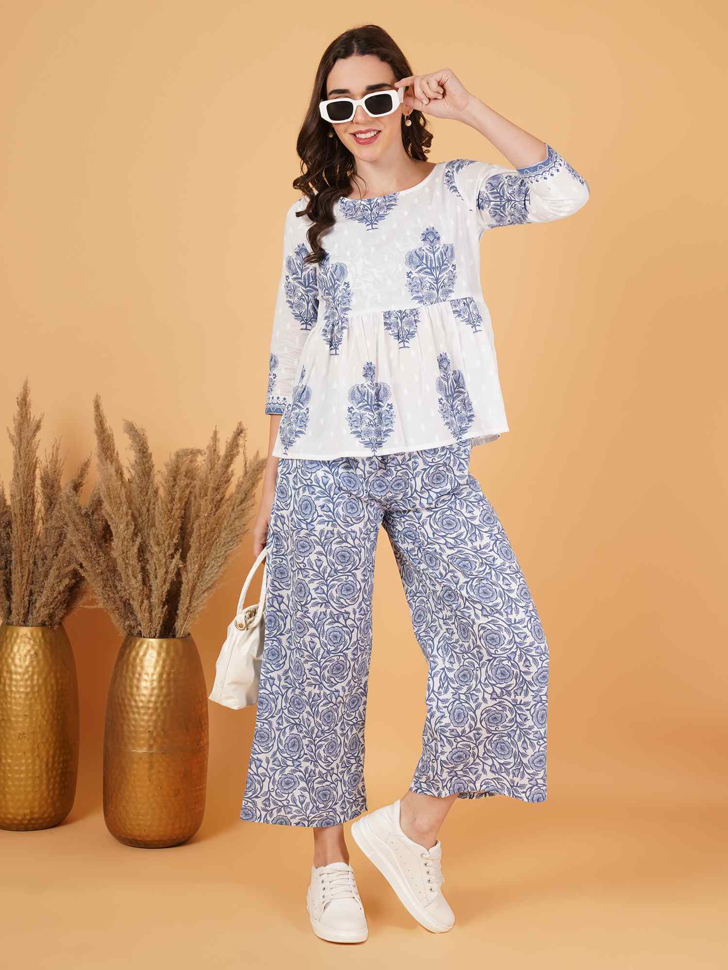 Sanganeri Patterned Cotton Peplum Top and Palazzo Set for Women