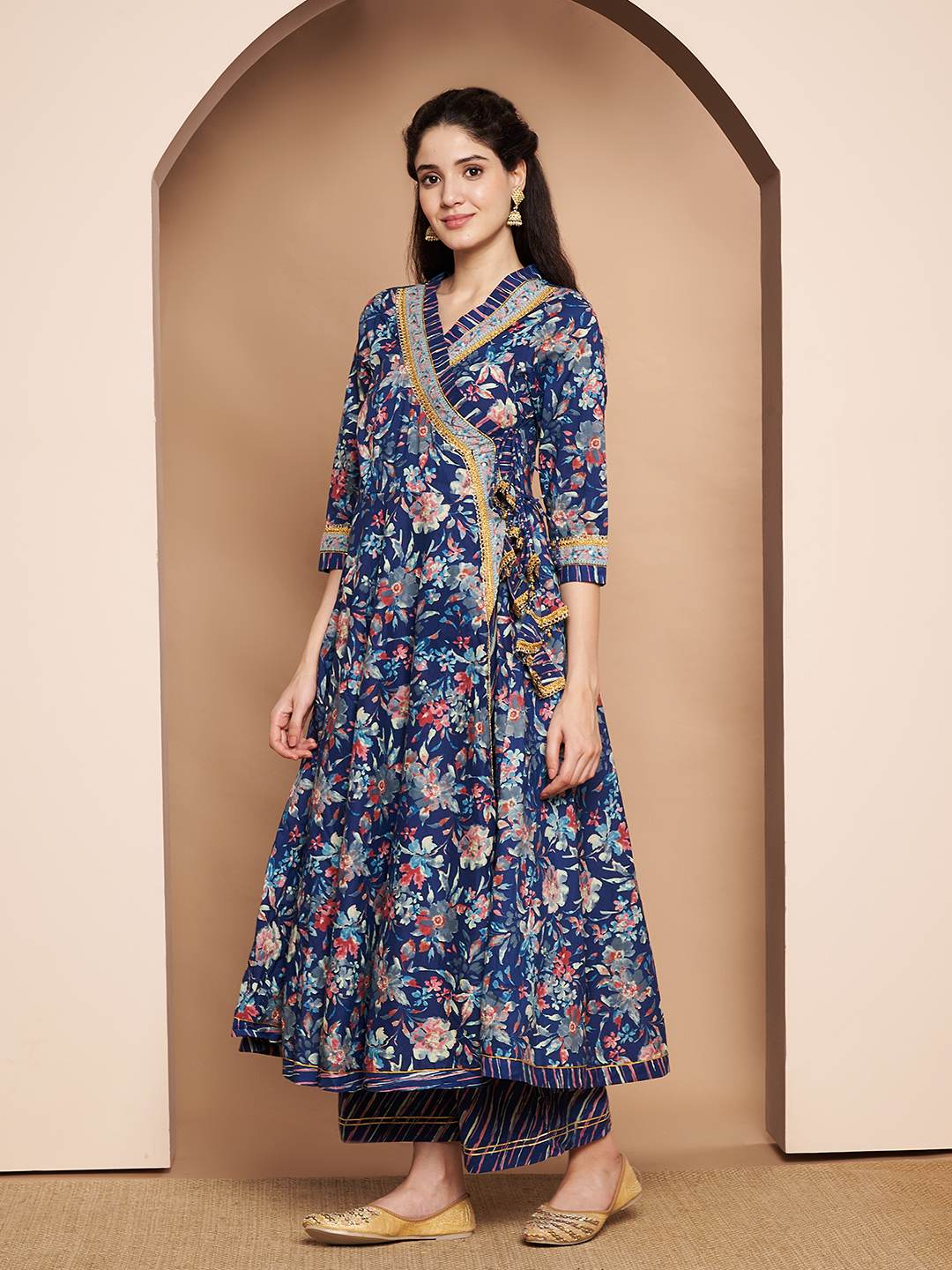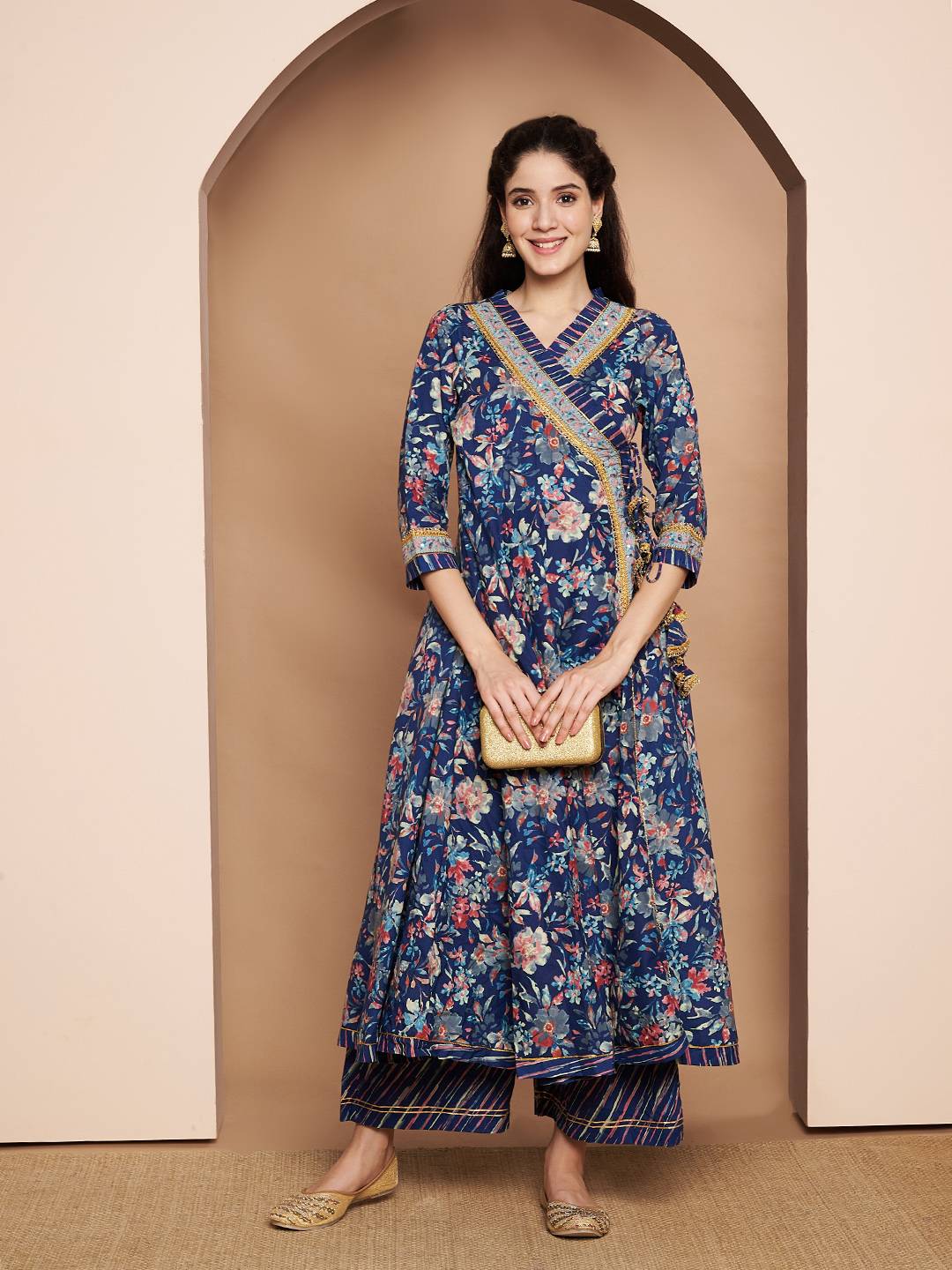 Heritage Royal Blue Angrakha Wrap Kurta with Palazzo Set For Women