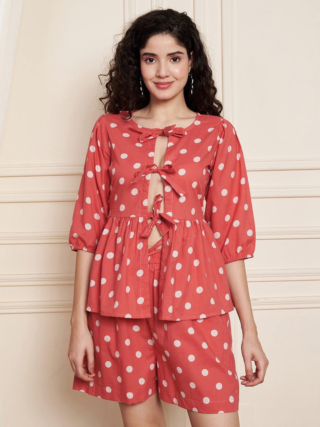 Front Tie-Up Polka Peplum Top and Shorts Cotton Co-Ord Set For Women