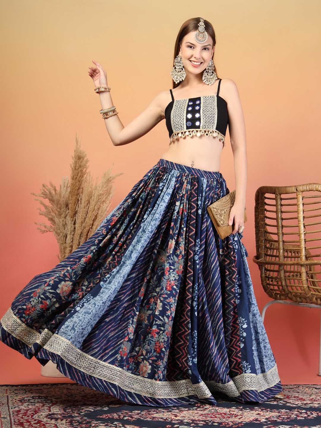 Navy Blue Traditional Mirror Work Cotton Lehenga Choli Set for Women