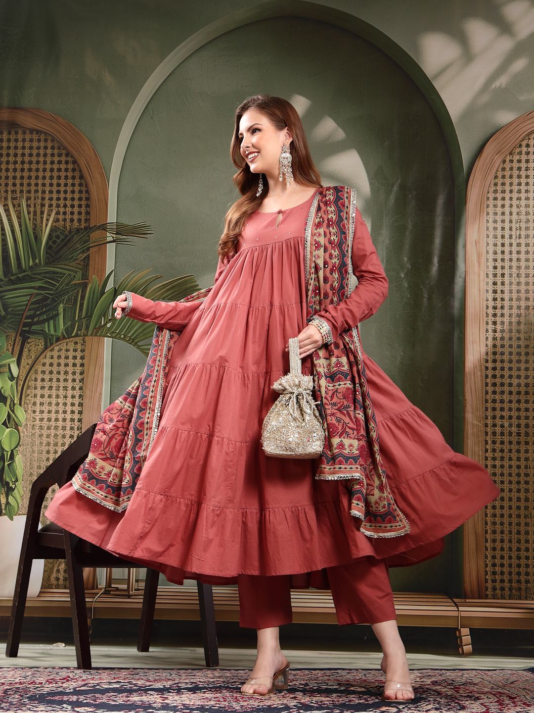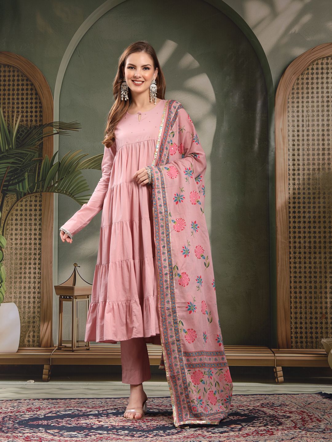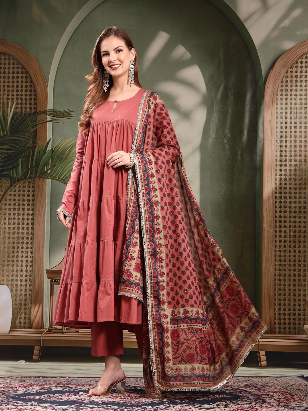 Pure Cotton Layered Kurta Pants Dupatta Set For Women