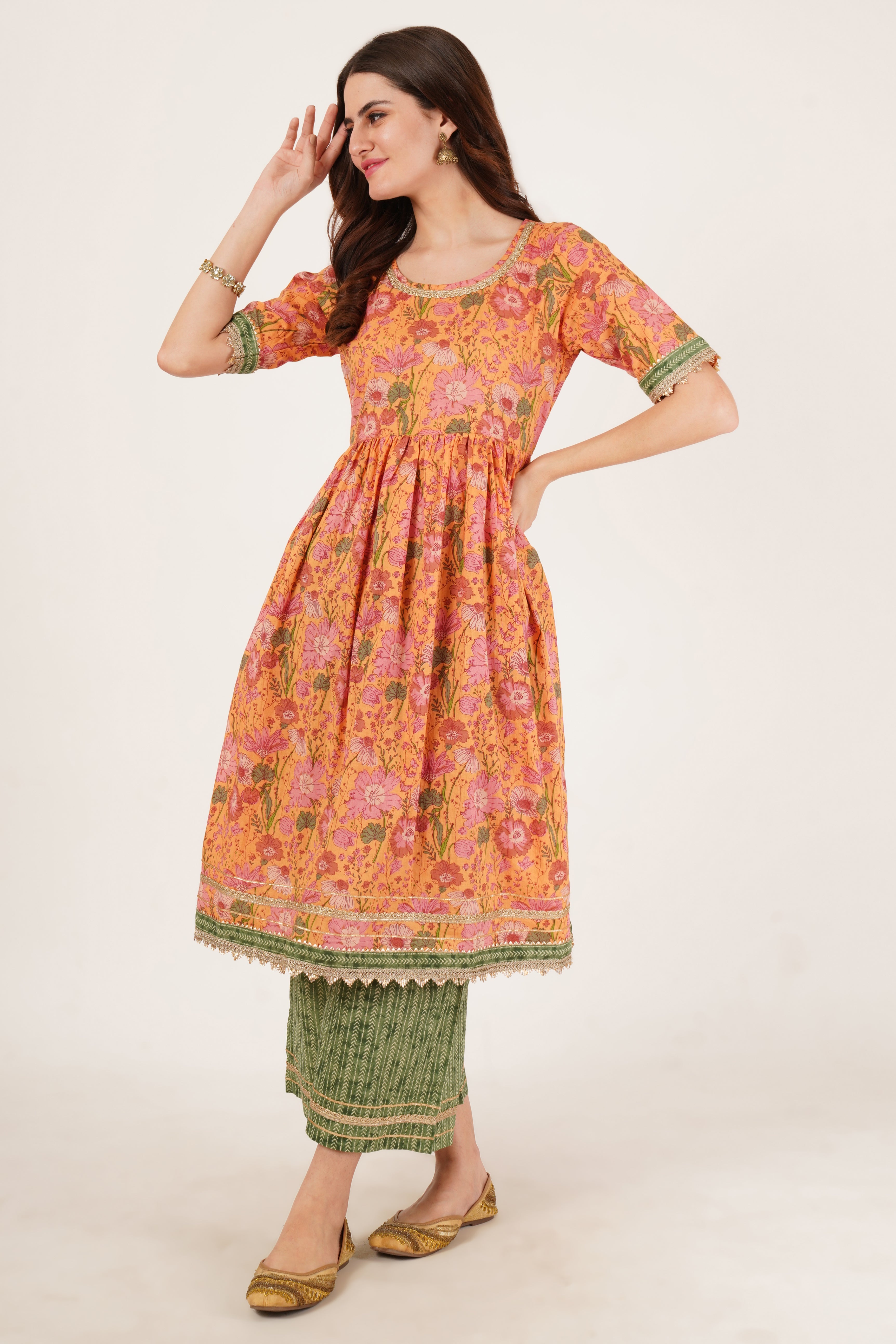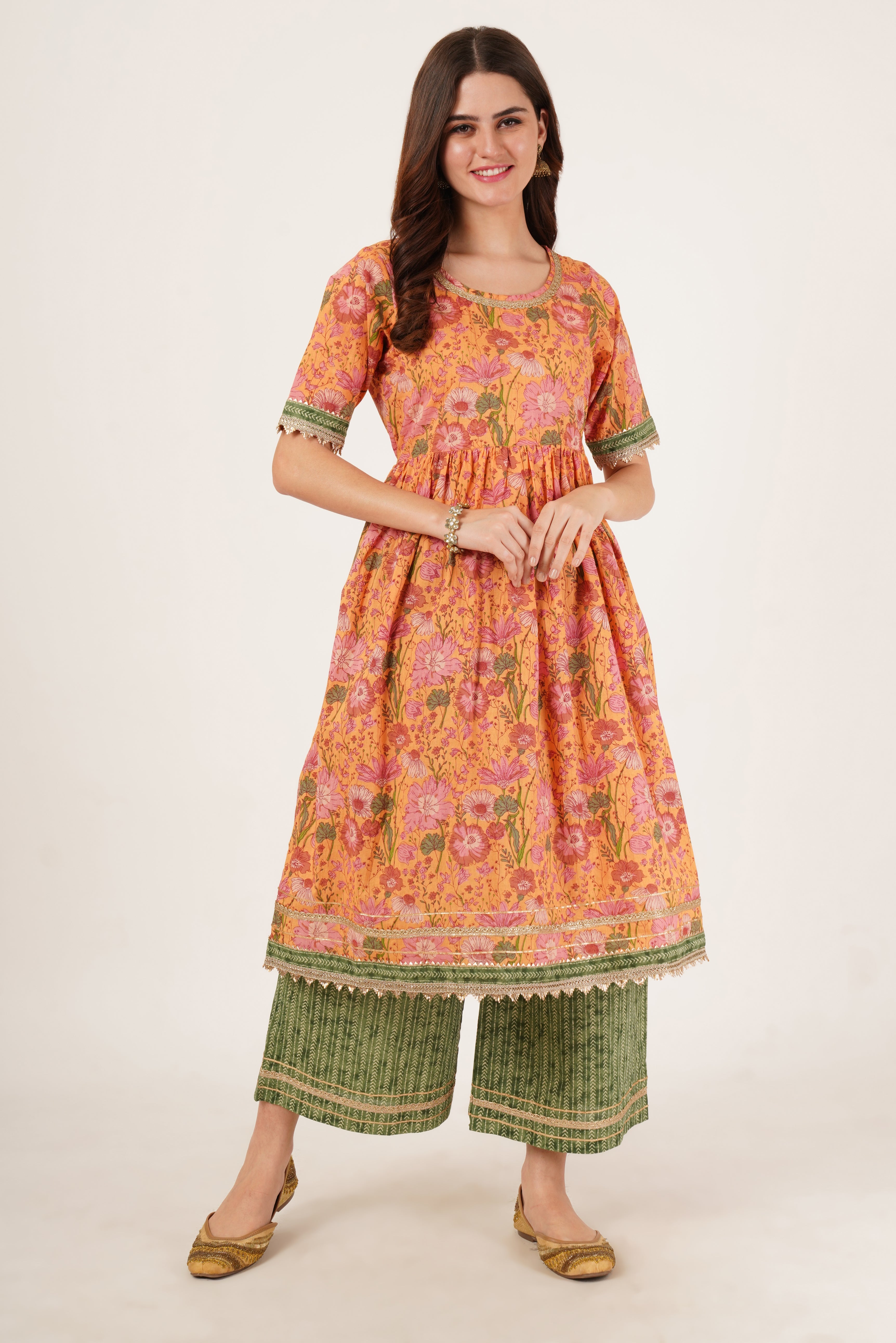 Elegant Jaipuri Cotton Flared Anarkali Kurta with Palazzo for Women