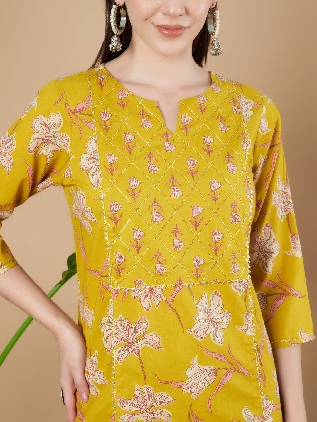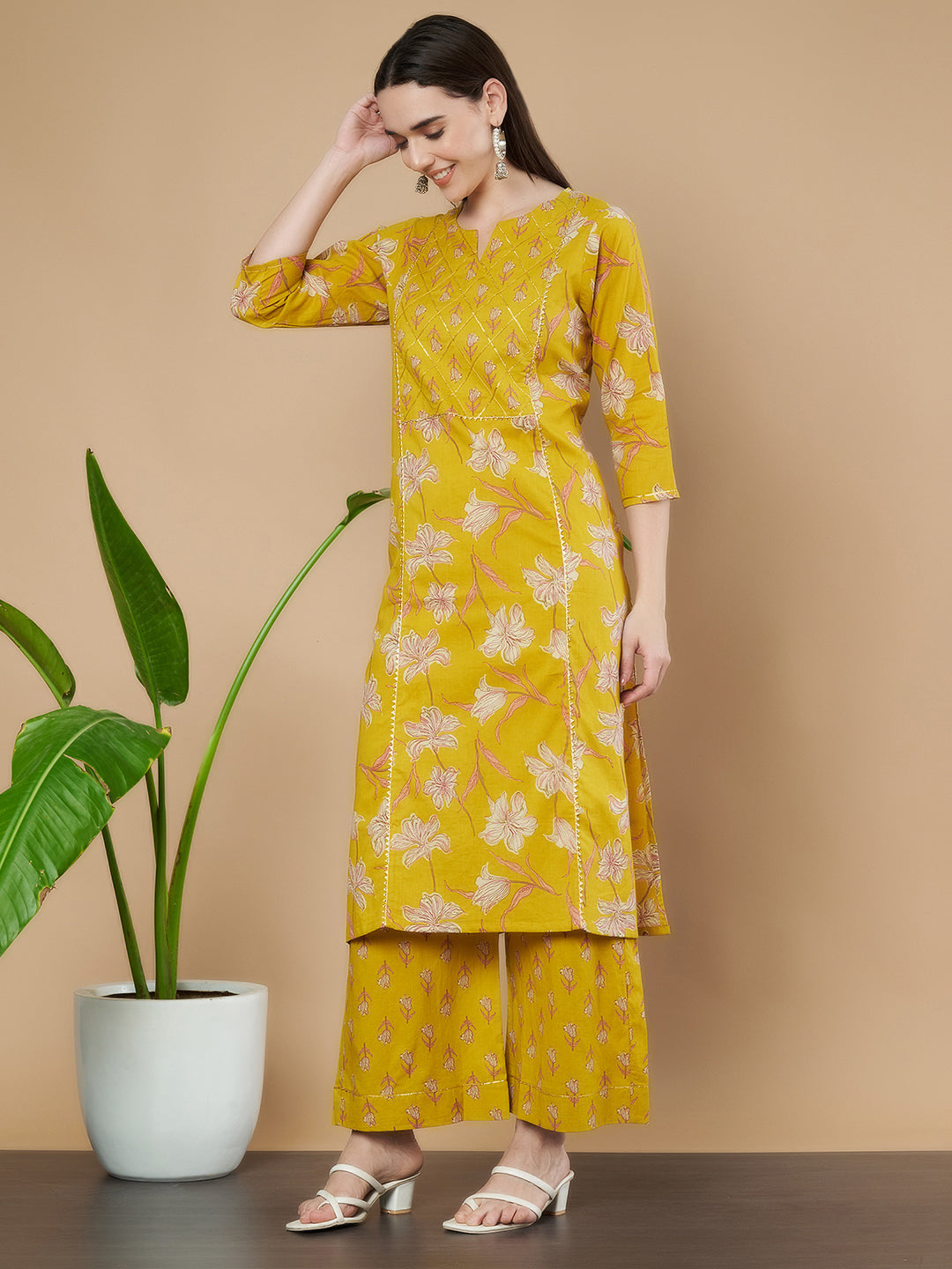 Senfgelbes Kurta- und Palazzo-Set aus Baumwolle für Damen