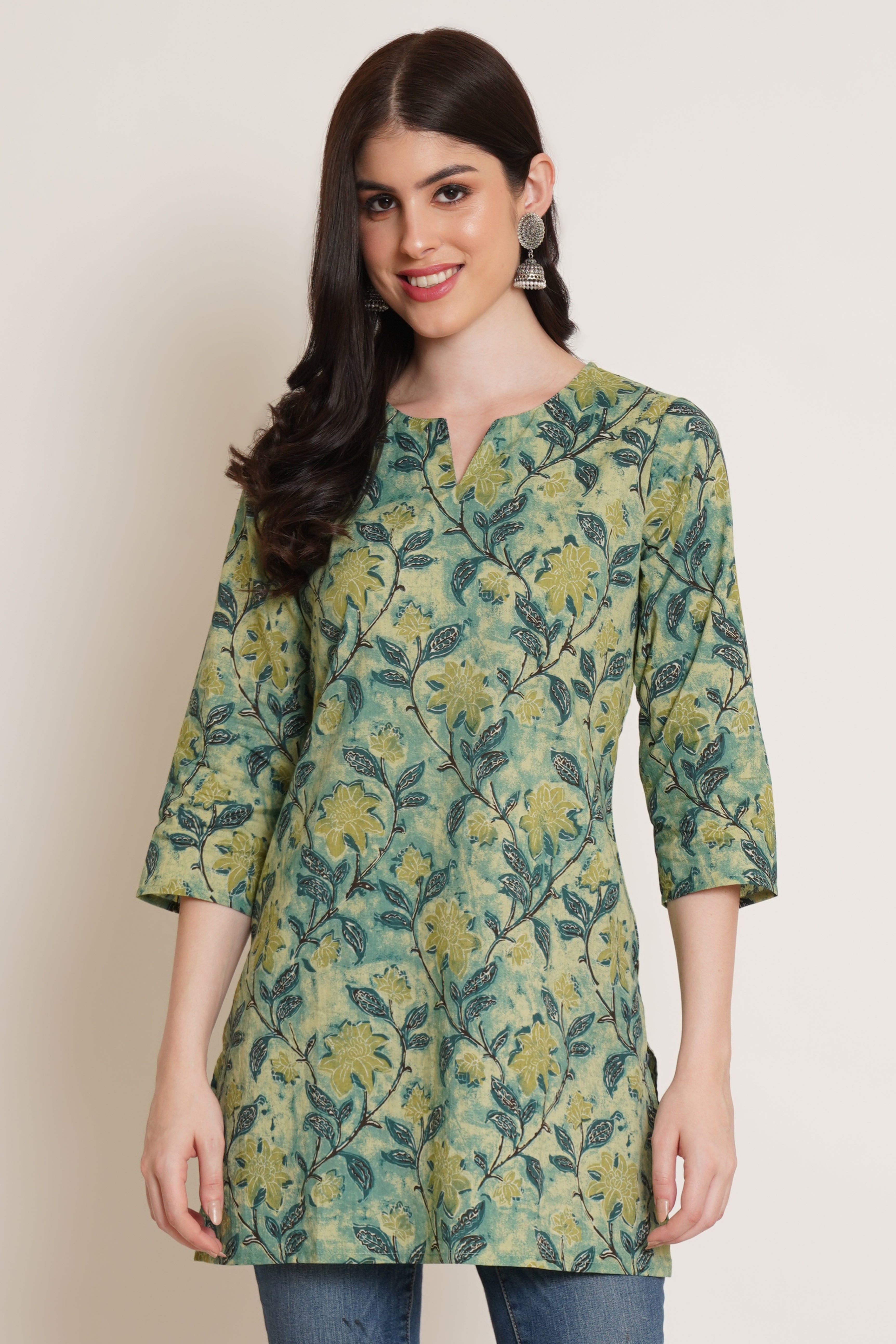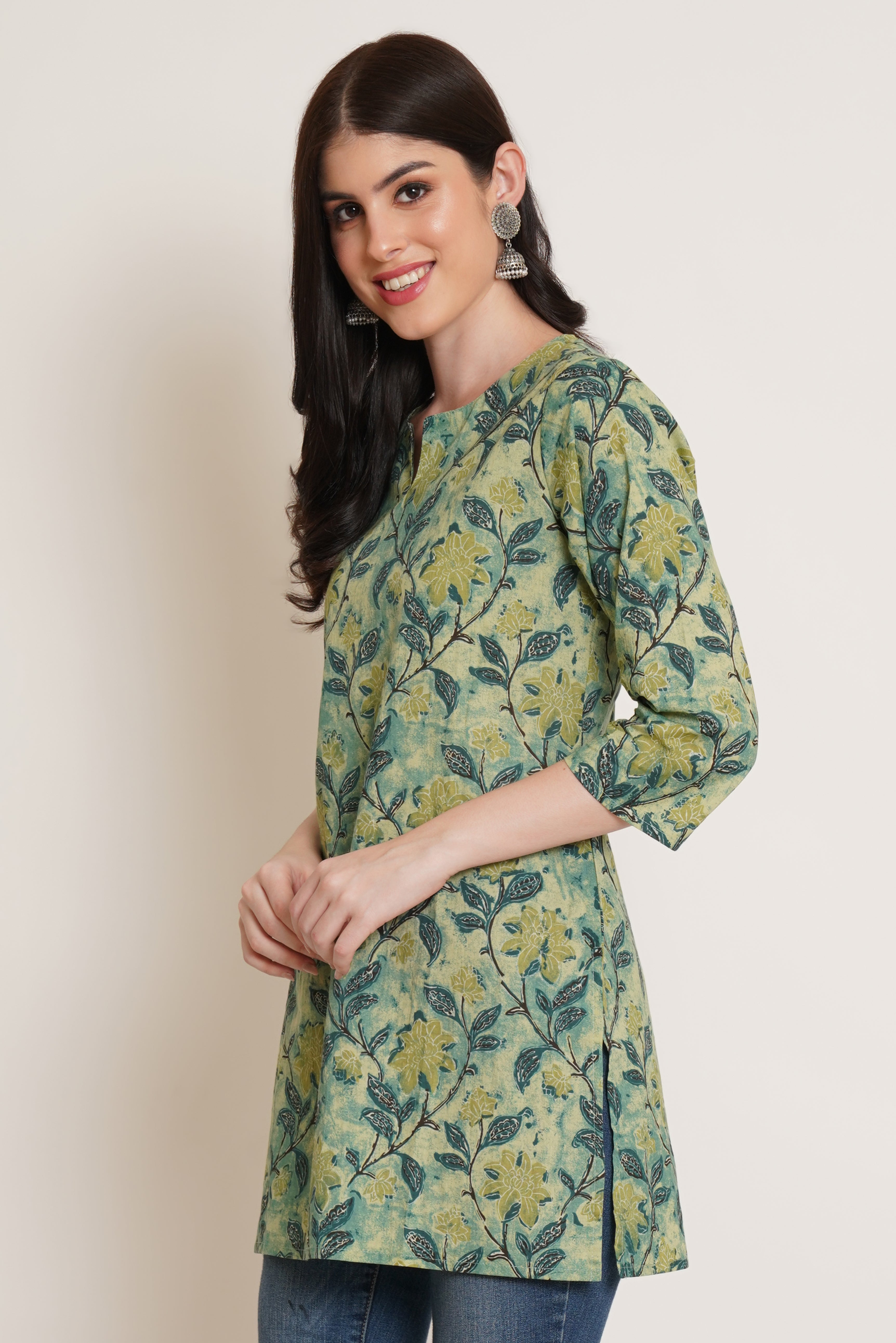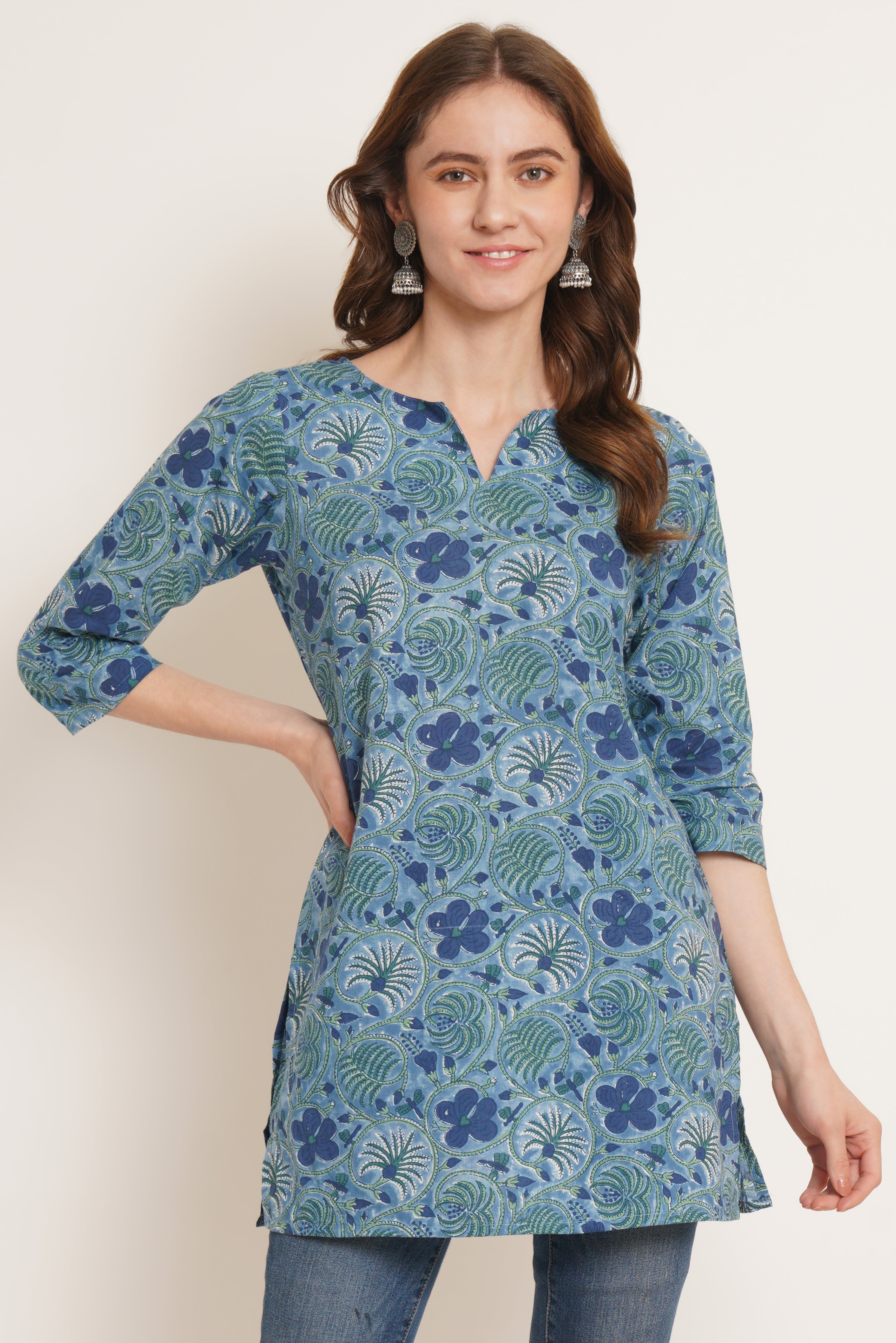 Türkises, kurzes Kurti aus Baumwolle mit Lilien-Aufdruck für Damen