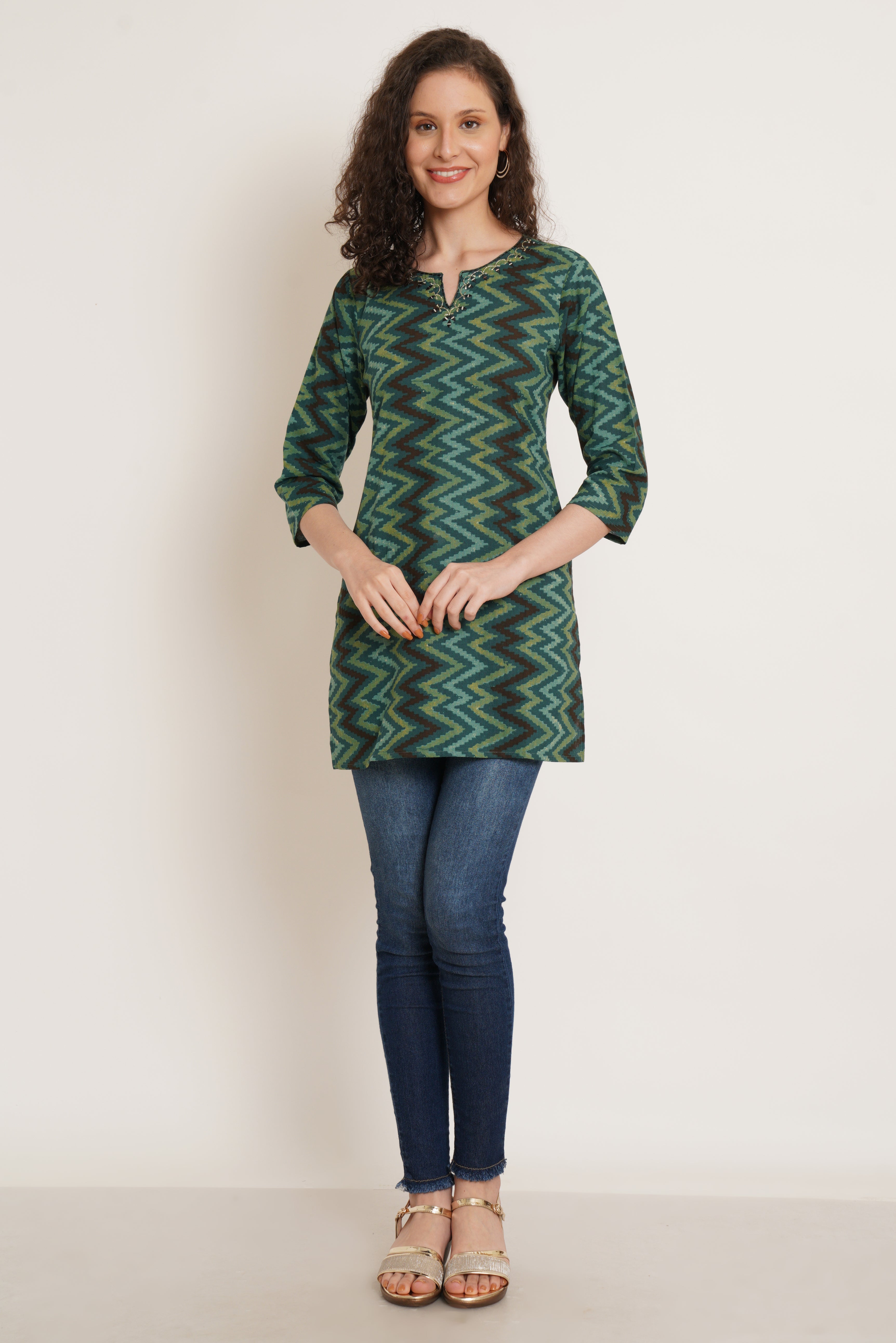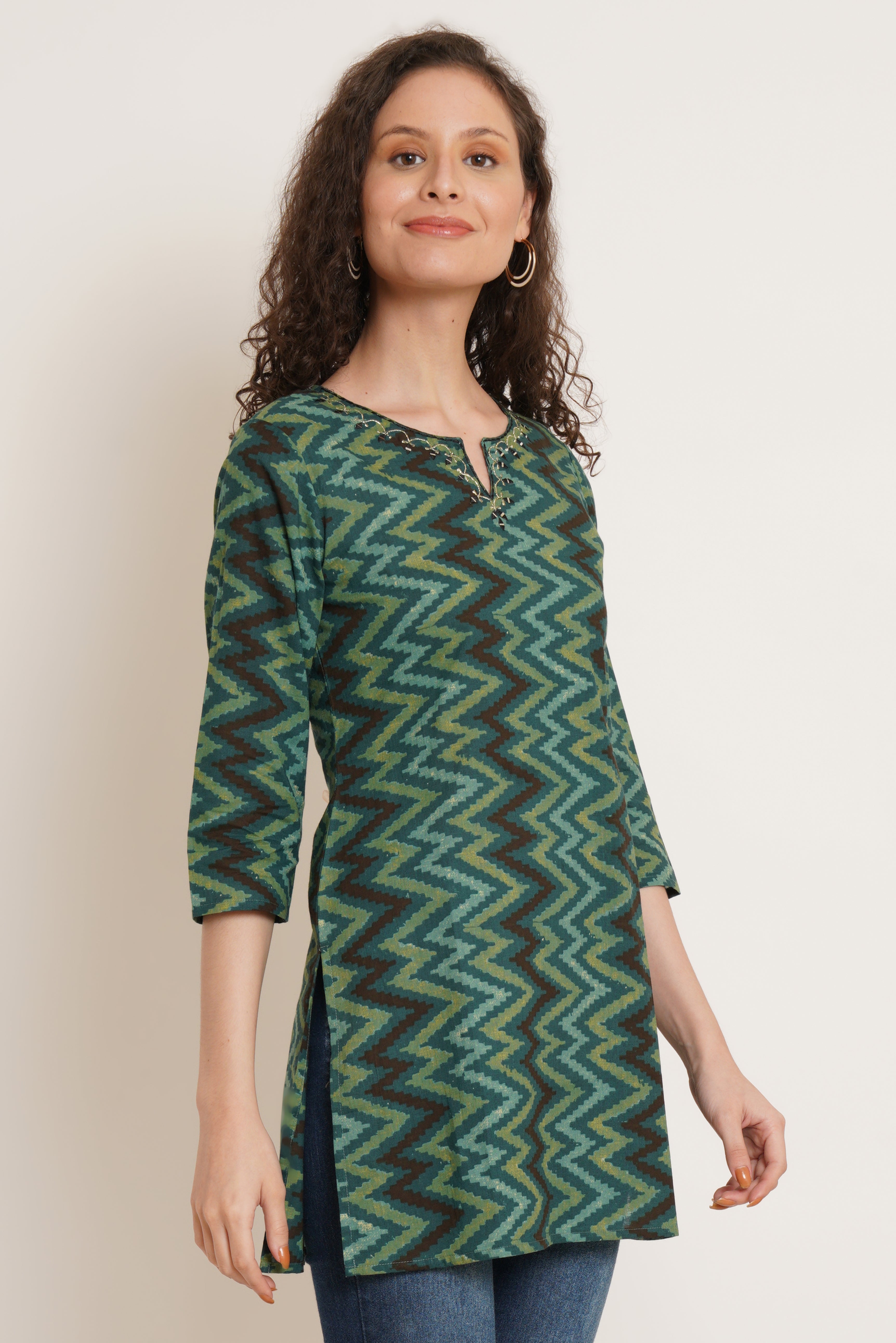 Grünes geometrisches Zickzack-Kurzes Kurti aus Baumwolle für Damen