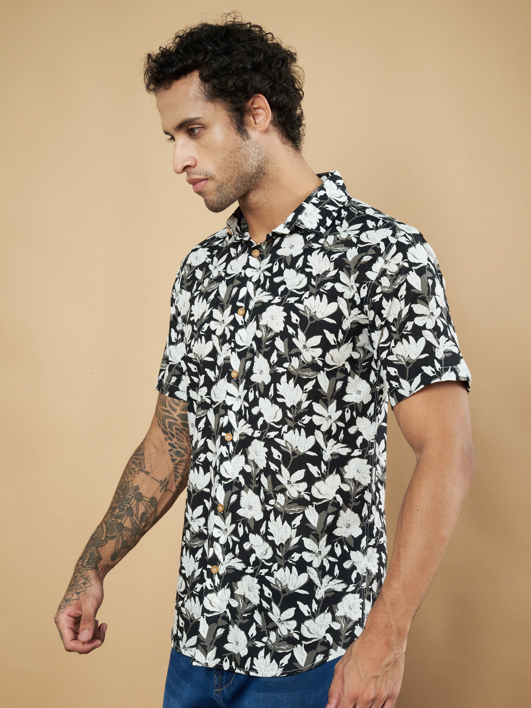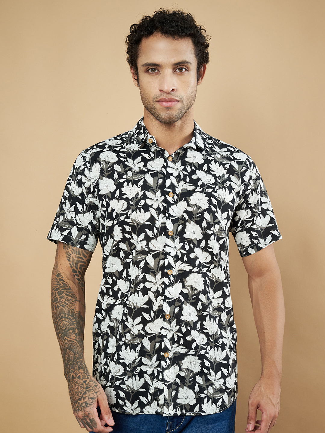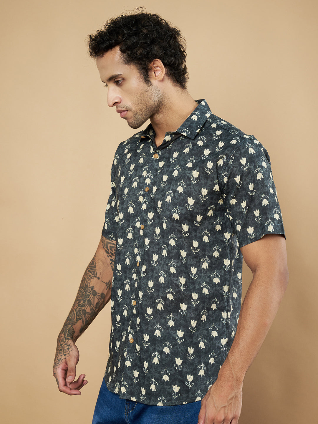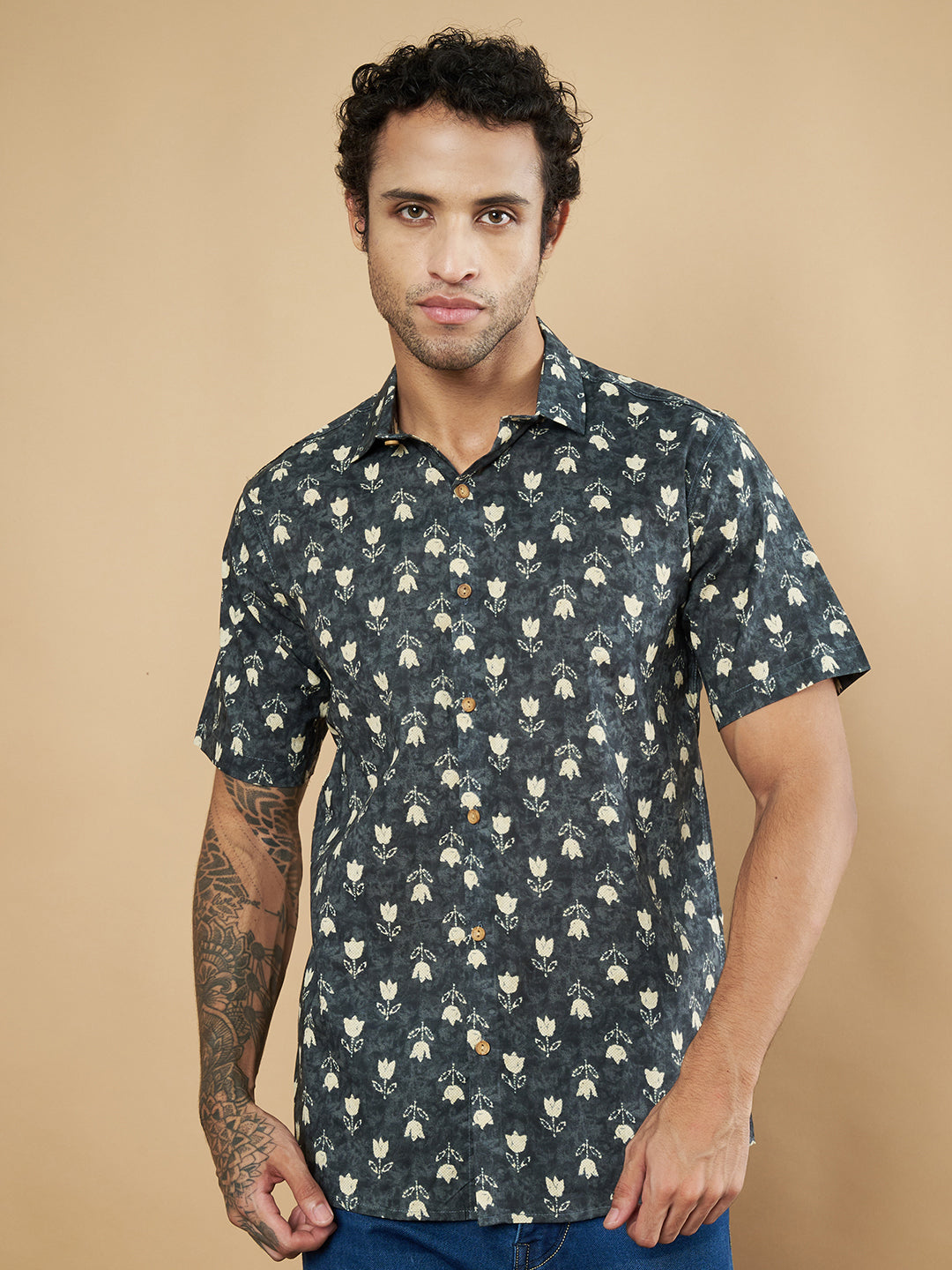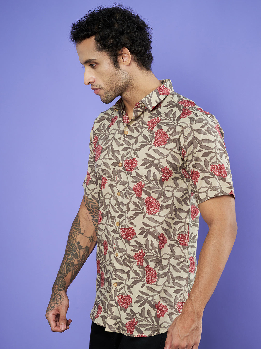 Chemise à manches mi-longues en coton Jaipuri beige à fleurs pour homme