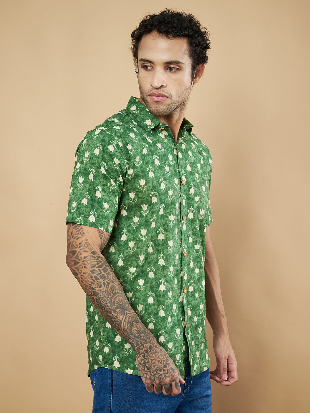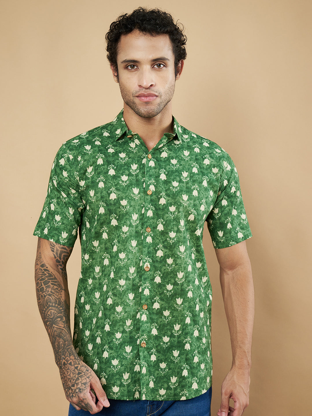 Chemise en pur coton à imprimé floral vert pour homme