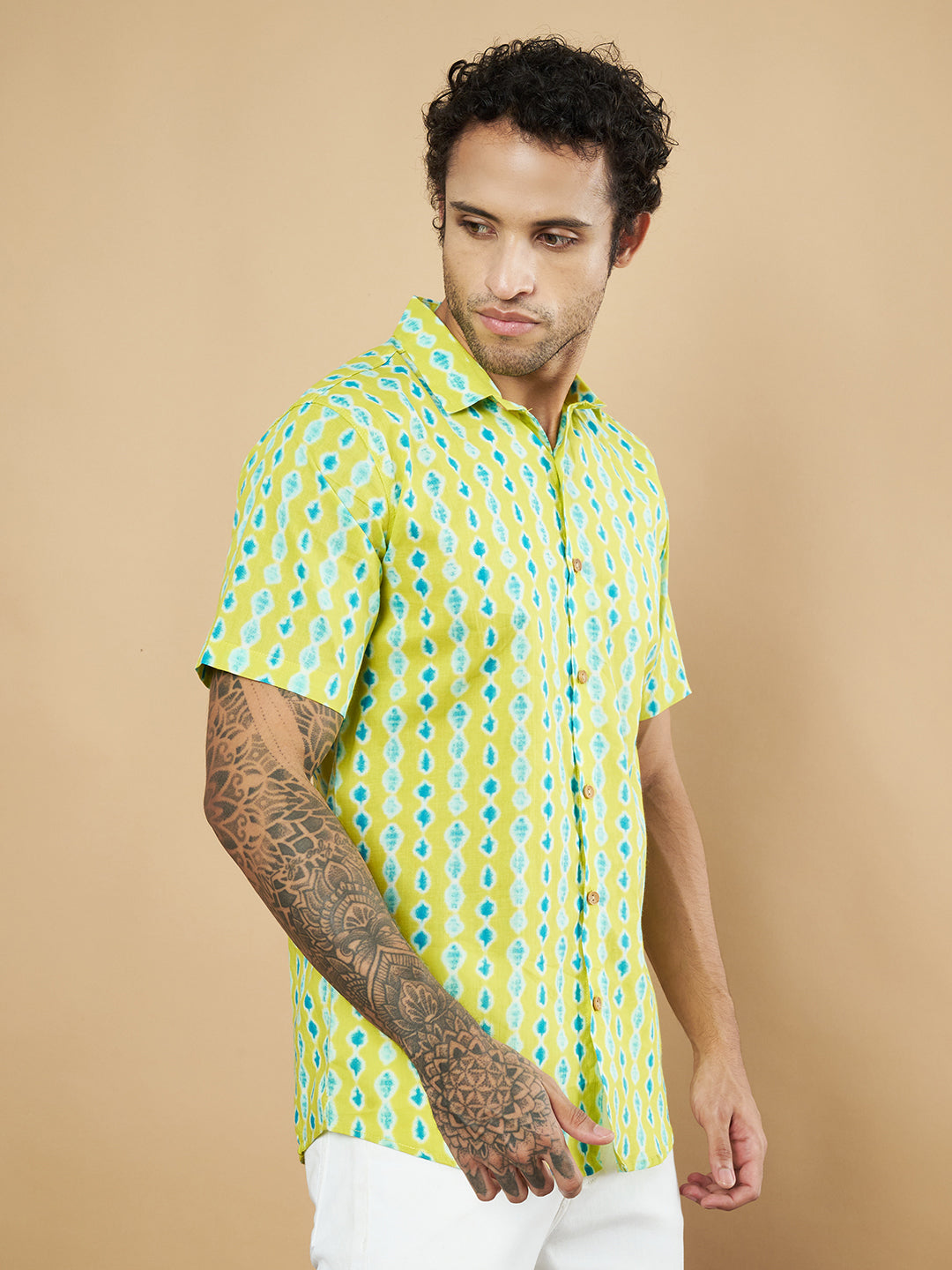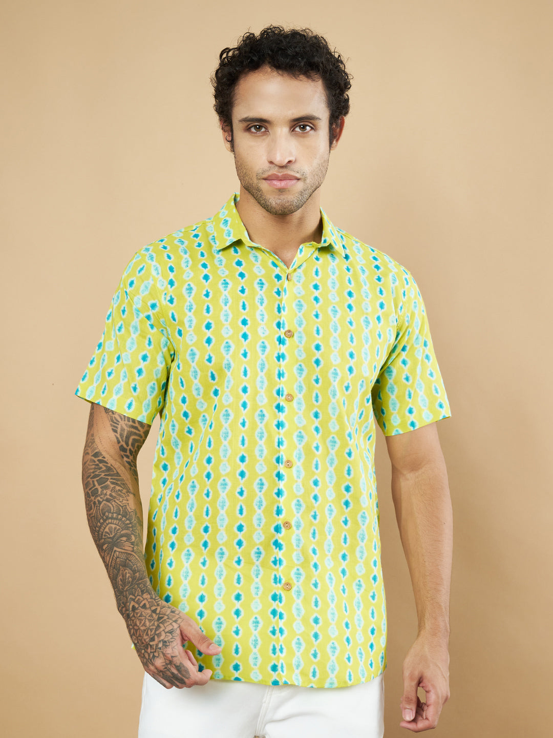 Chemise en coton à motif ikat vert citron vif pour homme