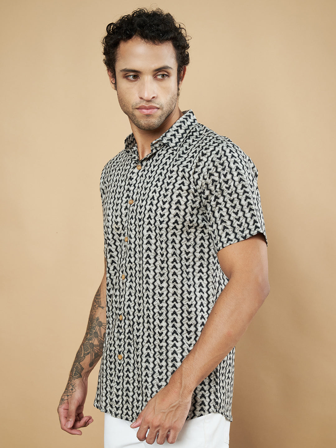 Chemise à manches mi-longues géométrique en pur coton noir et blanc pour homme