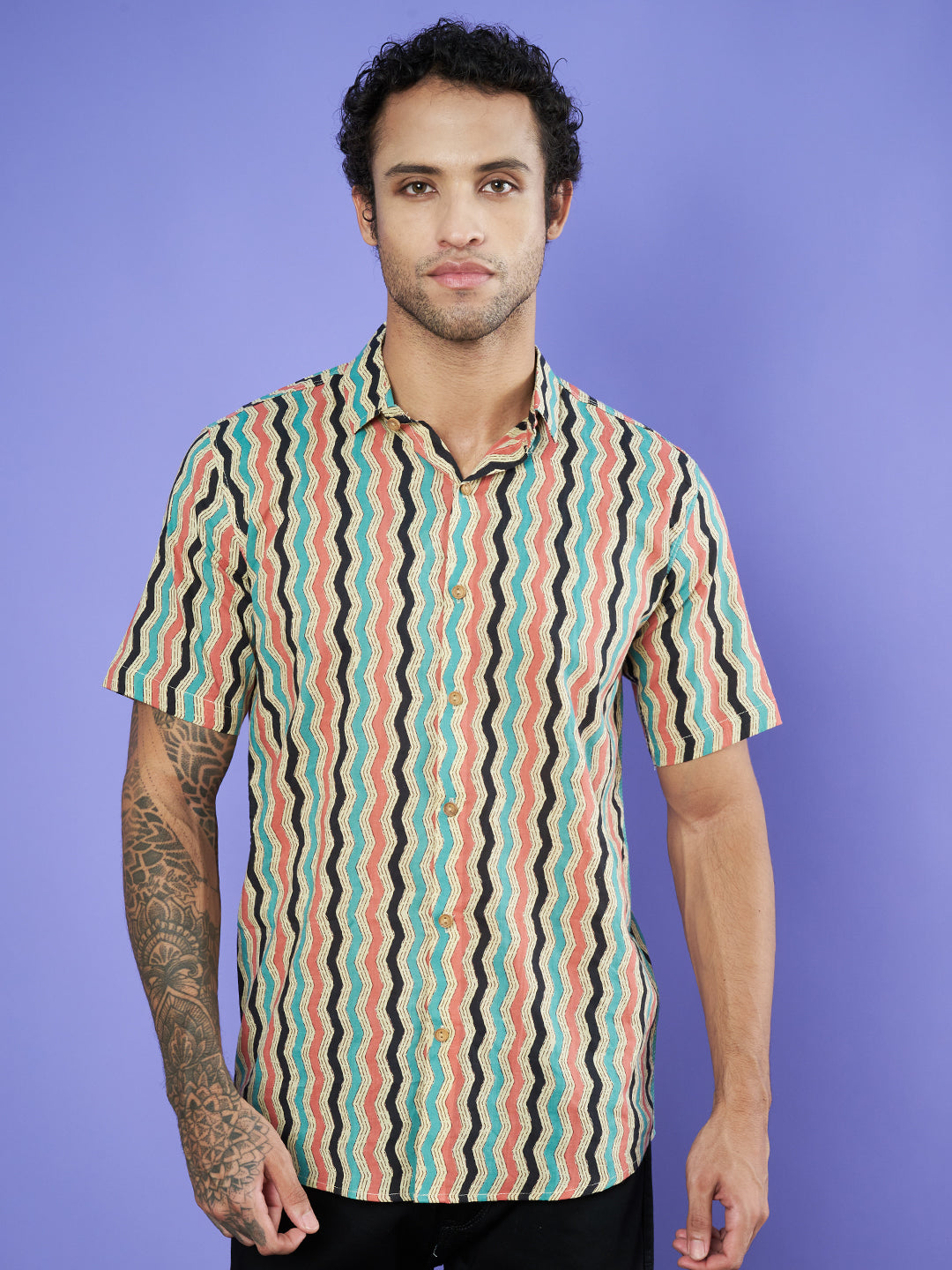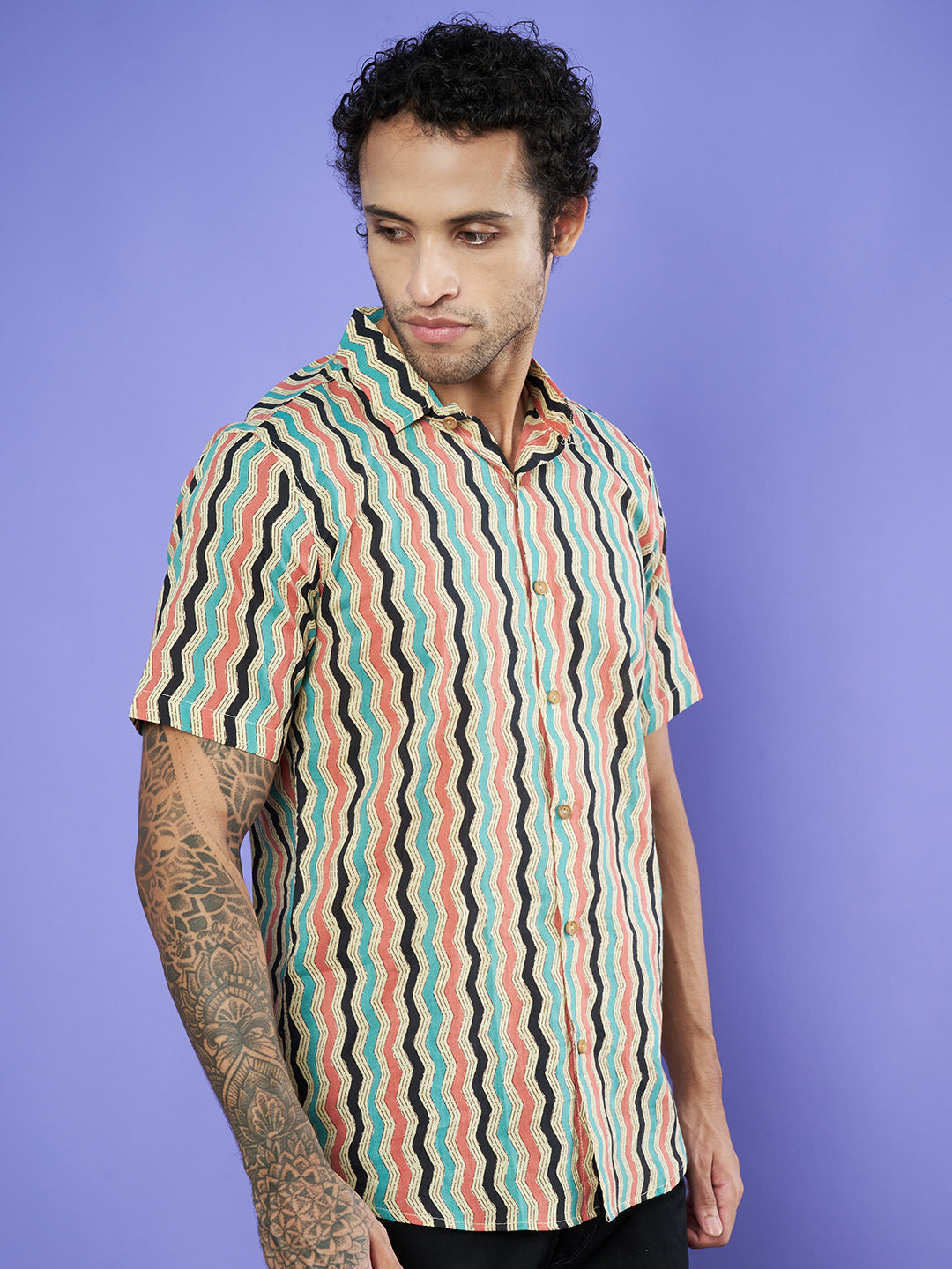 Chemise en coton à motif ondulé multicolore pour homme