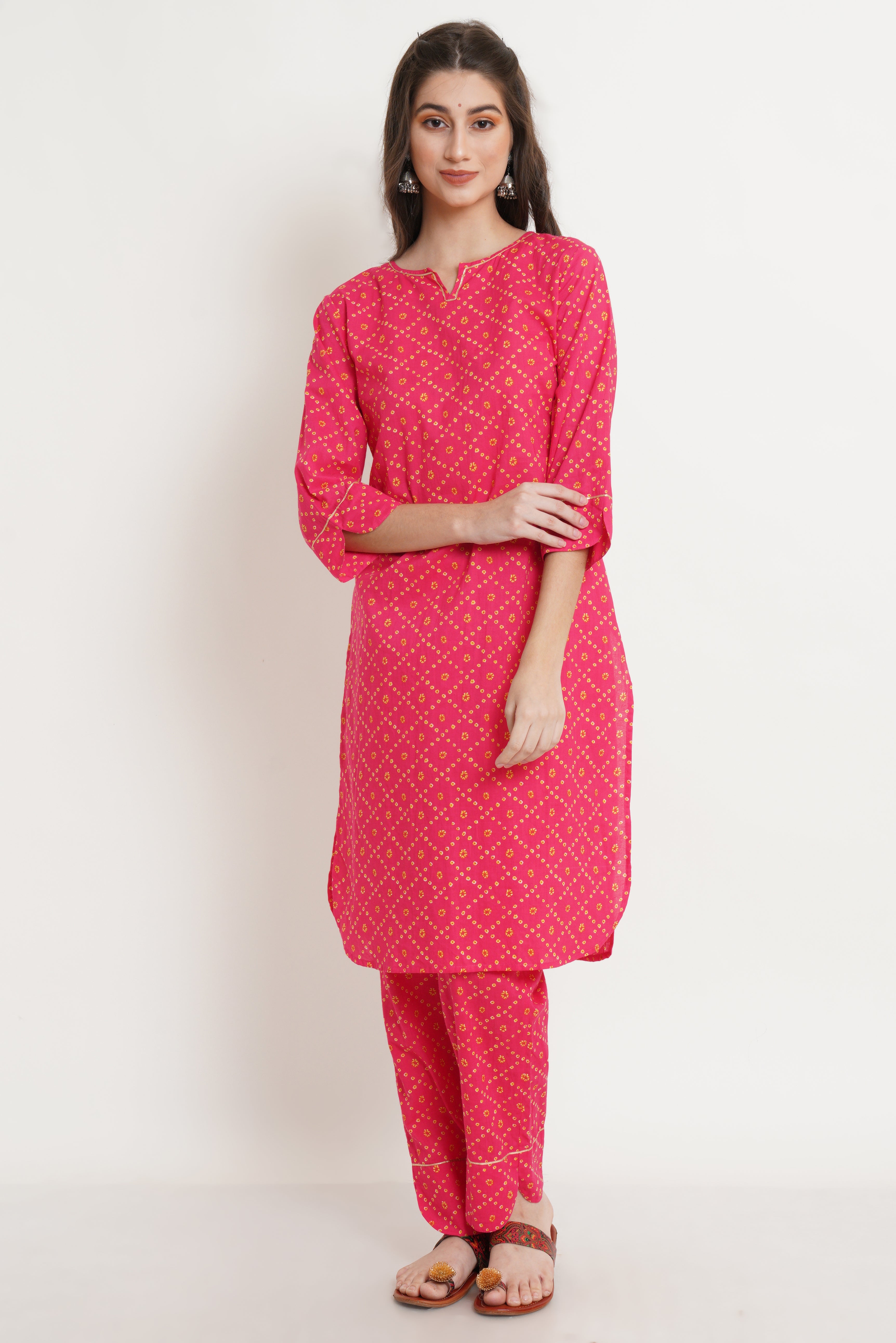 Elevate your ethnic wardrobe with the COTLAND FASHION Pink Bandhej Cotton Kurta and Pants Set, designed to blend tradition with modern style. Crafted with premium breathable cotton fabric, this set ensures all-day comfort and a luxurious feel against the skin. The kurta features an intricate floral print with bandhej details, complemented by apple cut silhouette and a chic round neckline. Its three-quarter sleeves add a touch of sophistication, making it perfect for casual gatherings or festive occasions.